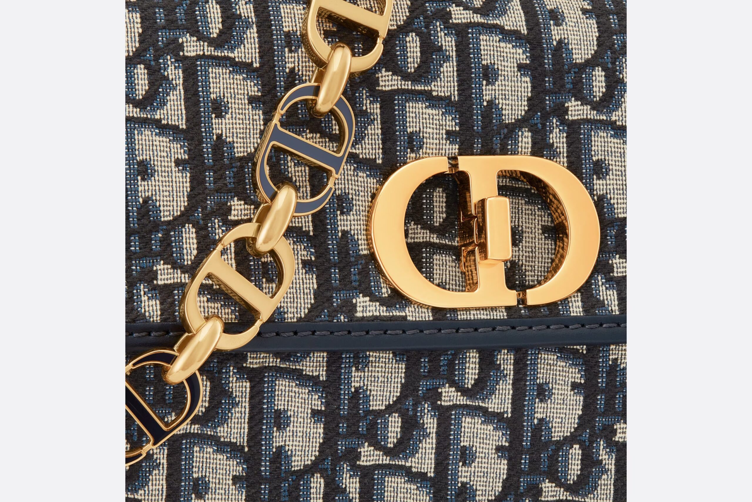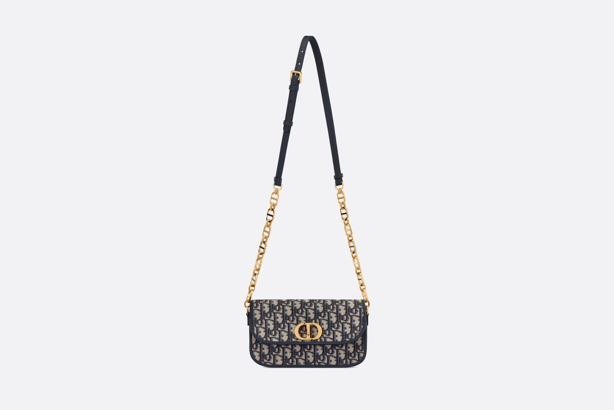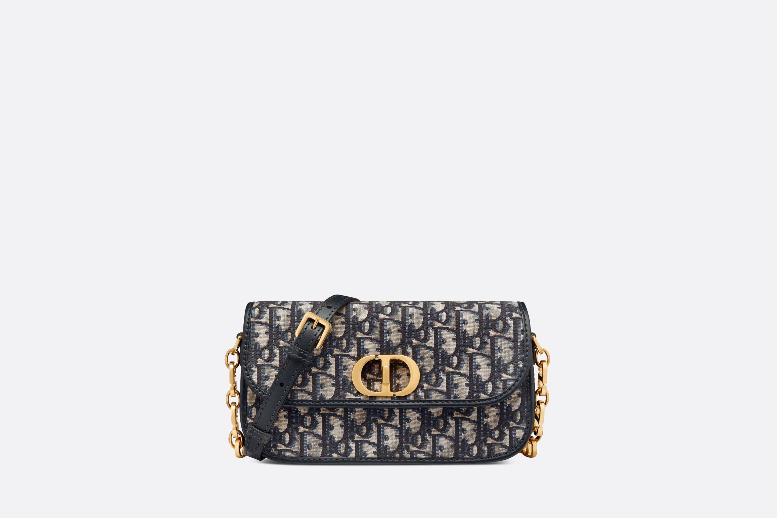 The 30 Montaigne Avenue bag enhances the hallmark line with a timeless and elegant style. Crafted in blue Dior Oblique jacquard, the rounded flap with delicate curves is punctuated by an antique gold-finish metal CD clasp inspired by the seal of a Christian Dior perfume bottle. The design is completed by other details, like the 30 Montaigne signature embossed on the back and the signature chain alternating gold-finish metal and tonal enamel links that match the leather. The gusseted bag features a spacious and refined silhouette that can be carried by hand, worn over the shoulder or crossbody.