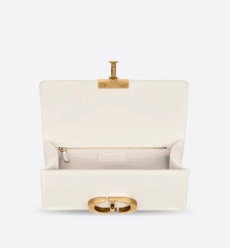 The 30 Montaigne line is inspired by the emblematic address and offers essential pieces that embody the House's iconic codes. The handbag is crafted in latte box calfskin for an elegant and modern look. The flap is embellished with an antique gold-finish metal 'CD' clasp, inspired by the seal of a Christian Dior perfume bottle. Refined details, such as an embossed '30 MONTAIGNE' signature on the back, define this unique design. Featuring an adjustable shoulder strap, the bag may be carried by hand, worn over the shoulder or crossbody.