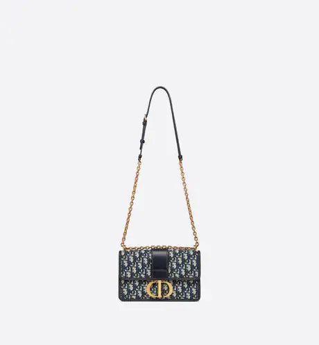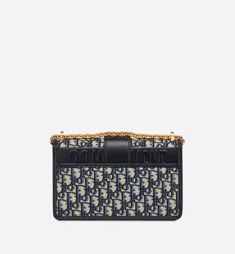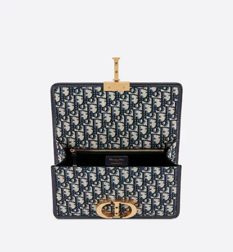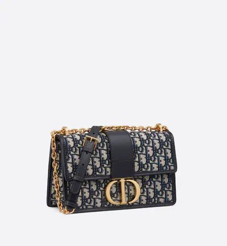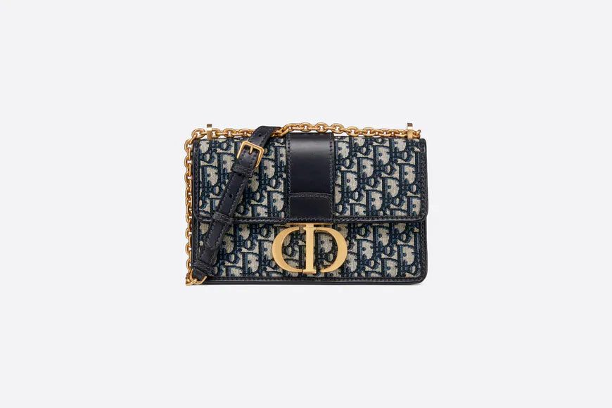 The 30 Montaigne line, inspired by the hallmark address, offers essential pieces that embody the House's iconic codes. The handbag is crafted in blue jacquard and highlights the House's iconic Dior Oblique motif for an elegant and modern design. The flap has an antique gold-finish metal 'CD' clasp, inspired by the seal of a Christian Dior perfume bottle. Other details, like the embossed '30 MONTAIGNE' signature at the back highlight the streamlined design. The bag features a chain that allows it to be carried by hand, worn over the shoulder or crossbody.