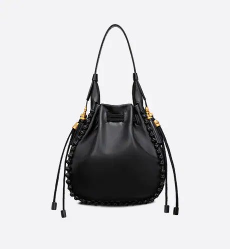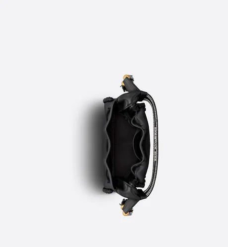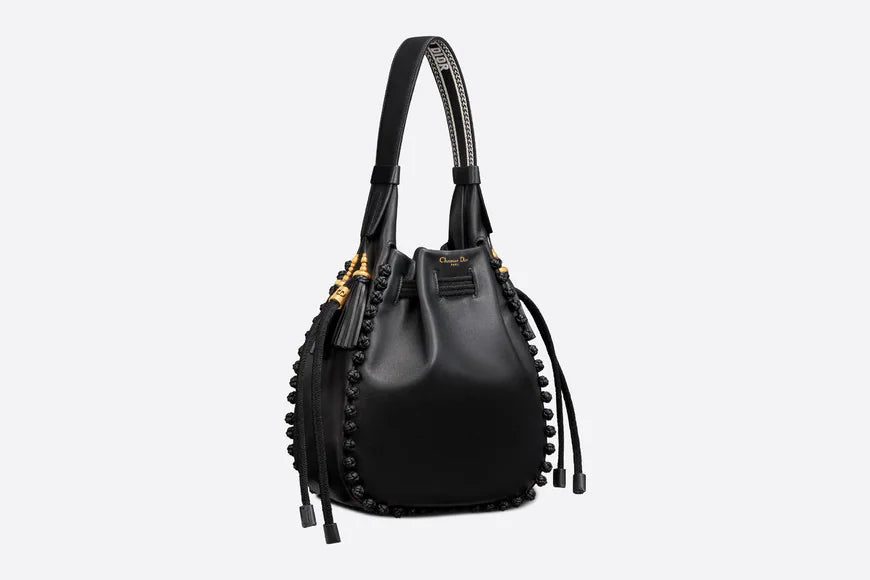 New this season, the hobo bucket bag reveals an elegant, contemporary silhouette. Crafted in luxurious black lambskin, the bag is embellished with small, meticulously handcrafted contrasting tassels and pompoms. A drawstring cord closure showcases the 'CD' initials, while a wide, adjustable shoulder strap embroidered with the 'CHRISTIAN DIOR' signature completes the modern creation.