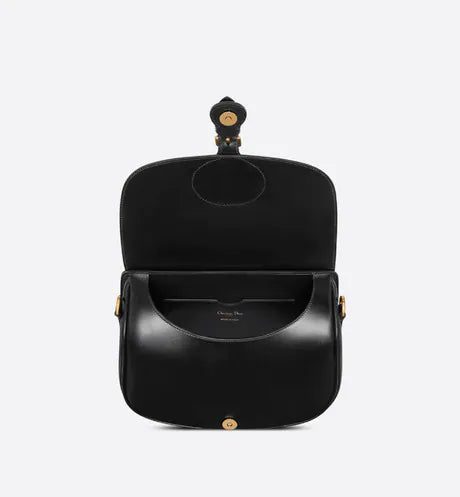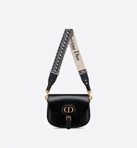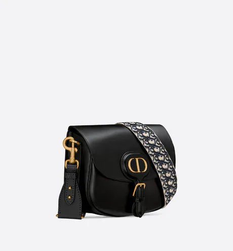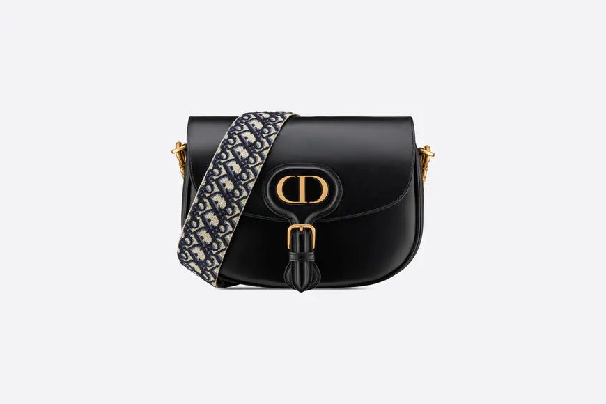 The Dior Bobby bag is a hobo style showcasing sophisticated lines and harmonious proportions. This large model is crafted from black box calfskin with a supple suede calfskin interior, and is enhanced with antique gold-finish metal hardware. Its wide blue Dior Oblique embroidered strap allows it to be carried by hand, worn over the shoulder or crossbody.