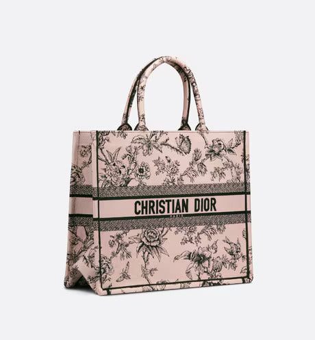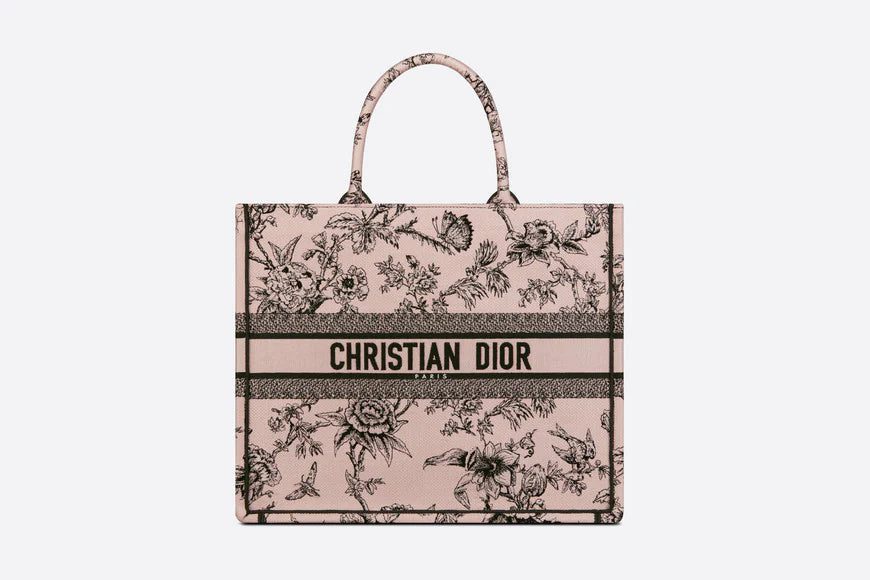 The Dior Book Tote is an original creation introduced by Maria Grazia Chiuri, Dior's Creative Director, and has become a staple of the Dior aesthetic. Designed to hold all the daily essentials, it is fully embroidered with the powder pink Dior Jardin Botanique motif and presents a romantic floral pattern inspired by Mr. Dior's beloved Granville gardens. Adorned with the 'CHRISTIAN DIOR PARIS' signature on the front, the large tote exemplifies the House's signature savoir-faire and may be carried by hand or worn over the shoulder.