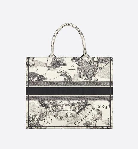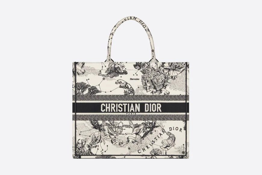 Introduced by Maria Grazia Chiuri, Creative Director of Christian Dior, the Dior Book Tote has become a staple of the Dior aesthetic. Designed to hold all the daily essentials, the latte style is fully embroidered with a Toile de Jouy Zodiac motif, a variation of the House's hallmark pattern that honors Mr. Dior's passion for astrology. Adorned with the 'CHRISTIAN DIOR PARIS' signature on the front, the large tote exemplifies the House's signature savoir-faire and may be carried by hand or worn over the shoulder.