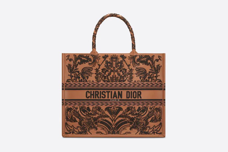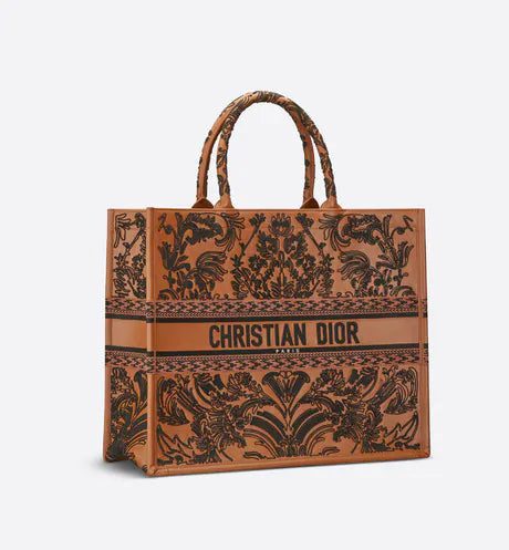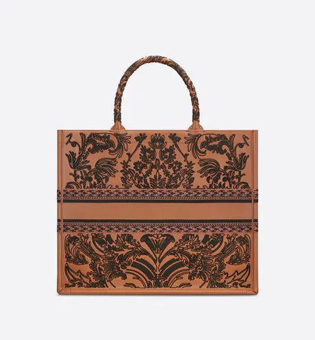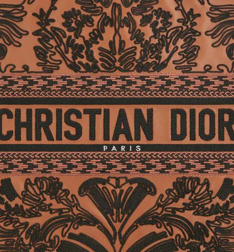 Introduced by Maria Grazia Chiuri, Dior's Creative Director, the Dior Book Tote has become a staple of the Dior aesthetic. Designed to hold all the daily essentials, the brown and black lambskin style features an Ornamental motif with a Cornely effect, inspired by Andalusian baroque in a graphic spirit. The design is adorned with the 'CHRISTIAN DIOR PARIS' signature on the front and exemplifies the House's signature savoir-faire. The large tote may be carried by hand or worn over the shoulder.