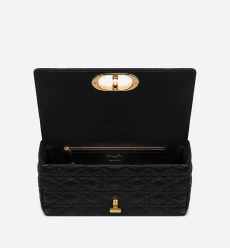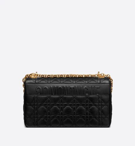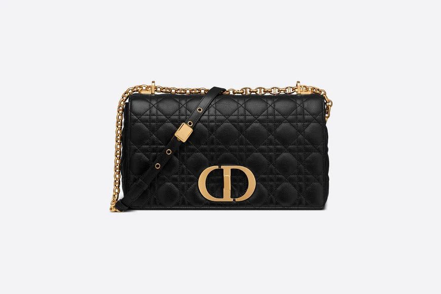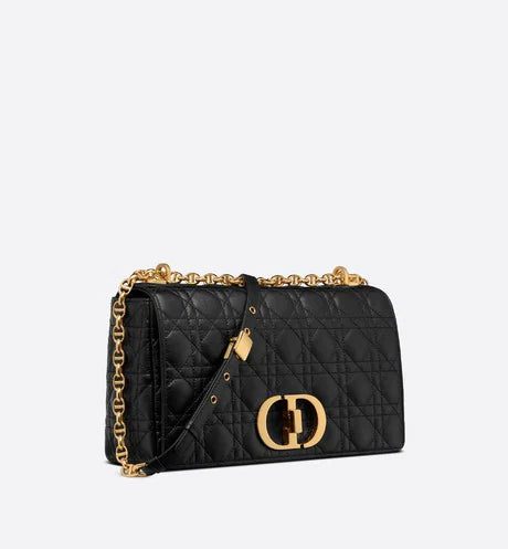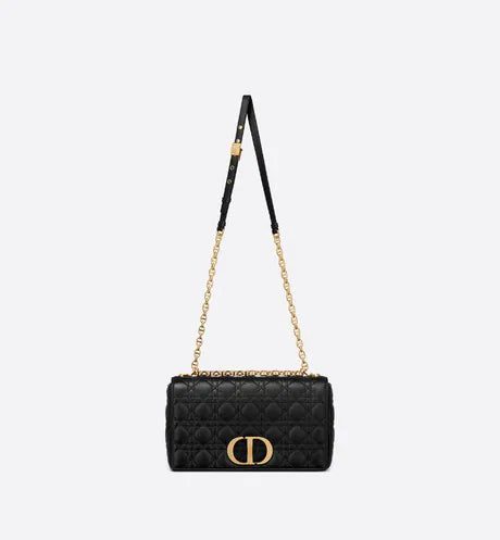 The Dior Caro bag combines modernity with timeless elegance. The design is crafted in black supple calfskin with Cannage stitching. The bag features a flap adorned with an antique gold-finish metal 'CD' twist clasp, inspired by the seal of a Christian Dior perfume bottle. The detachable chain shoulder strap with 'CD' signature links allows it to be carried by hand, over the shoulder or crossbody, or replaced by one of the House's wide embroidered straps, allowing the large bag to pair with day or evening attire.