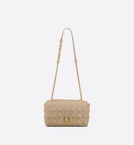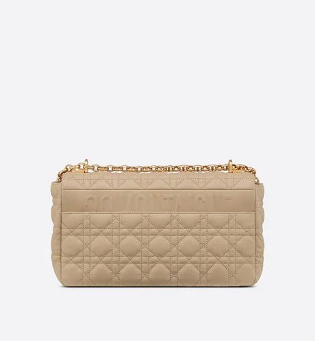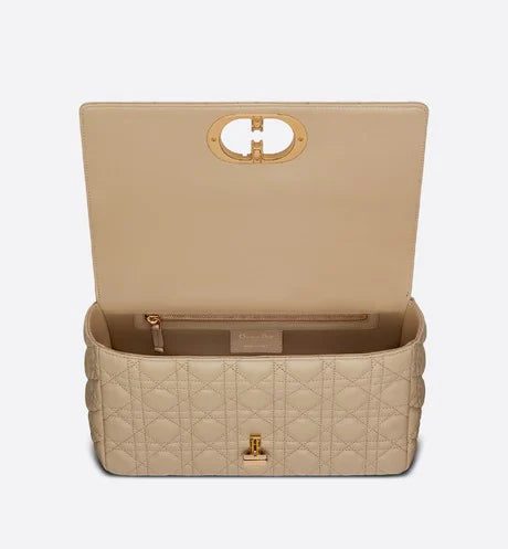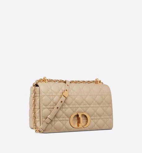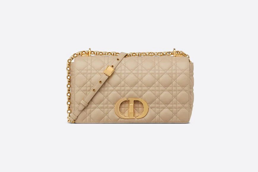 The Dior Caro bag combines modernity with timeless elegance. The design is crafted in beige supple calfskin with Cannage stitching. The bag features a flap adorned with an antique gold-finish metal 'CD' twist clasp, inspired by the seal of a Christian Dior perfume bottle. The detachable chain shoulder strap with 'CD' signature links allows it to be carried by hand, over the shoulder or crossbody, or replaced by one of the House's wide embroidered straps, allowing the large bag to pair with day or evening attire.
