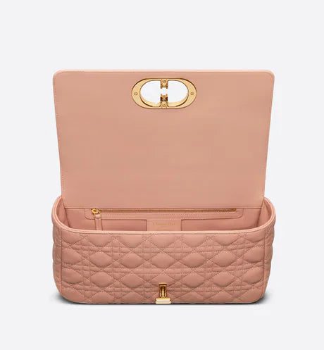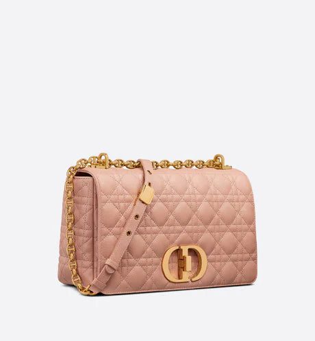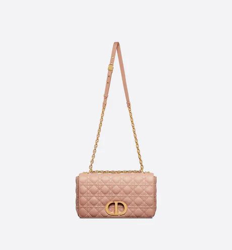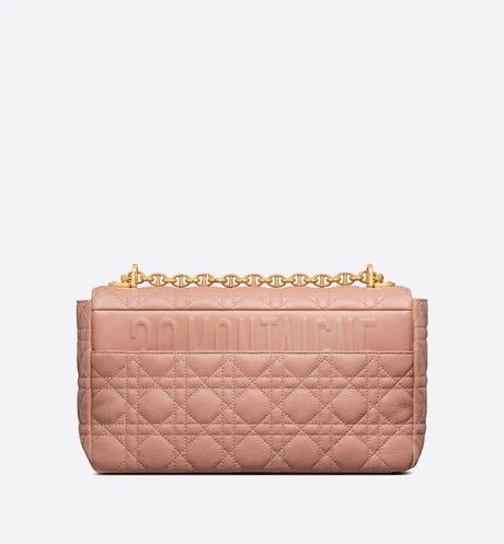 The Dior Caro bag combines modernity with timeless elegance. The design is crafted in Rose des Vents calfskin with Cannage stitching. The supple bag features a flap adorned with an antique gold-finish metal 'CD' twist clasp, inspired by the seal of a Christian Dior perfume bottle. The detachable chain shoulder strap with 'CD' signature links allows the large bag to be carried by hand or worn over the shoulder and may be replaced by one of the House's wide embroidered straps for day or evening attire.