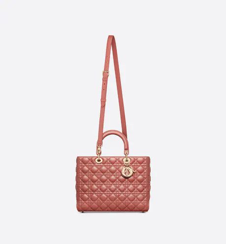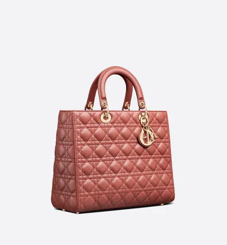 The Lady Dior handbag epitomizes the House's vision of elegance and beauty. Refined and sleek, this creation is timeless. Crafted in rust-color lambskin with Cannage stitching, it boasts an instantly recognizable quilted texture. The pale gold-finish metal 'D.I.O.R.' charms embellish and illuminate its silhouette. Featuring a thin, removable leather shoulder strap, the large Lady Dior bag can be carried by hand or worn crossbody.
