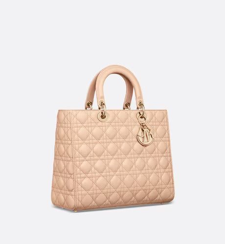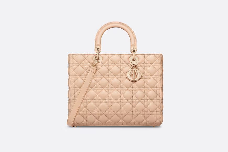 The Lady Dior bag embodies Dior's vision of elegance and beauty. Refined and sleek, the timeless style is crafted in Sand pink lambskin with Cannage stitching, creating the instantly recognizable quilted texture. Pale gold-finish metal D.I.O.R. charms offer elegant appeal. Featuring a removable thin leather shoulder strap, the large Lady Dior bag can be carried by hand or worn crossbody.