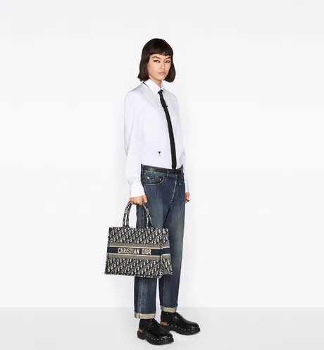The Dior Book Tote is an original creation introduced by Dior's Creative Director, Maria Grazia Chiuri, and has become a staple of the Dior aesthetic. Designed to hold all the daily essentials, it is fully embroidered with the multicolor Rêve d'Infini motif by artist Pietro Ruffo, offering a dreamlike new take on Christian Dior's favorite star symbol and essential House code. Adorned with a 'CHRISTIAN DIOR PARIS' signature on the front, the medium tote exemplifies the House's signature savoir-faire and may be carried by hand or worn over the shoulder.