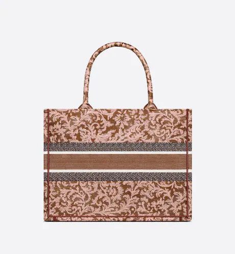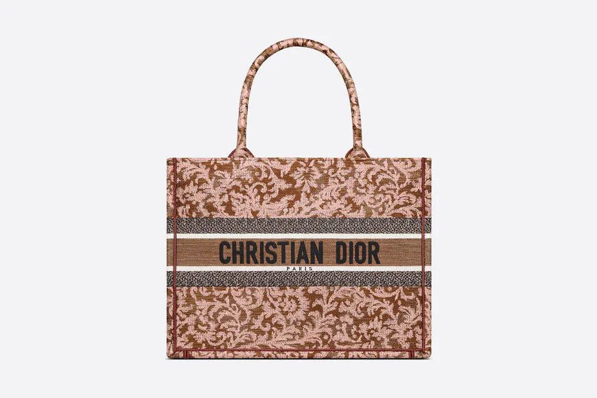 The Dior Book Tote is an original creation introduced by Maria Grazia Chiuri, Dior's Creative Director, and has become a staple of the Dior aesthetic. Designed to hold all the daily essentials, it is fully embroidered with the metallic pink Dior Brocart motif, offering a new take on House codes. Adorned with the 'CHRISTIAN DIOR PARIS' signature on the front, the medium tote exemplifies the House's signature savoir-faire and may be carried by hand or worn over the shoulder.
