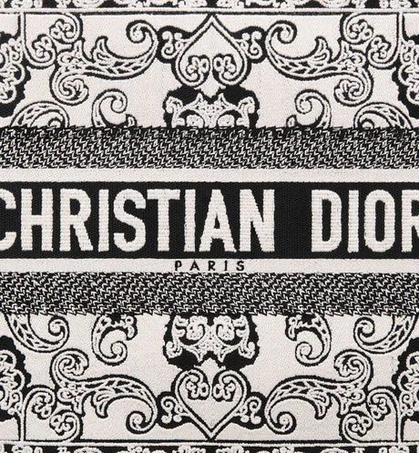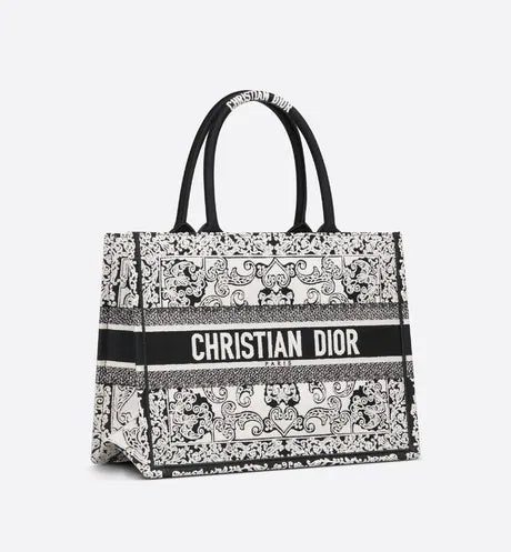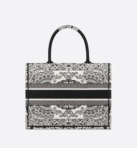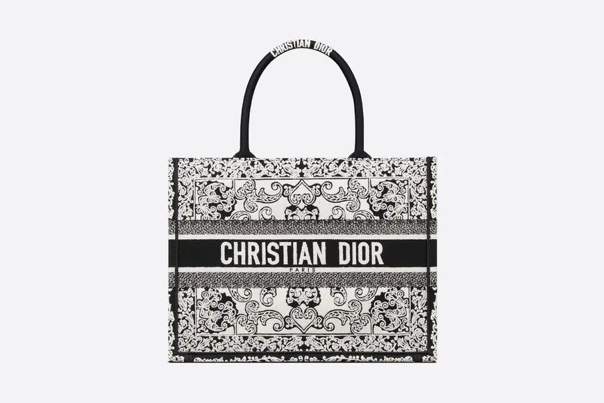 The Dior Book Tote is an original creation introduced by Maria Grazia Chiuri, Dior's Creative Director, and has become a staple of the Dior aesthetic. Designed to hold all the daily essentials, it is fully embroidered with the white and black Dior Bandana motif, reinterpreting a timeless pattern with the collection's signature Seville inspiration. Adorned with the 'CHRISTIAN DIOR PARIS' signature on the front, the medium tote exemplifies the House's signature savoir-faire and may be carried by hand or worn over the shoulder.