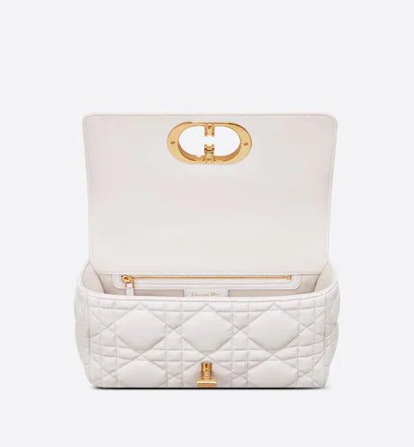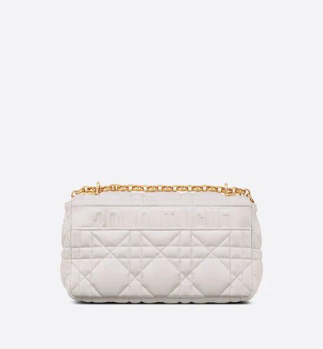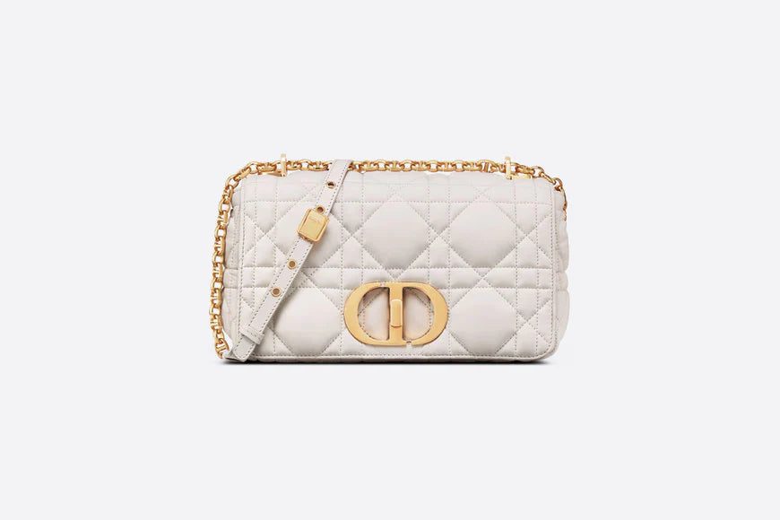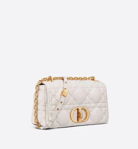 The Dior Caro bag combines modernity with timeless elegance. The design is crafted in latte matte calfskin and is distinguished by its original quilted-effect Macrocannage stitching. The bag features a flap adorned with an antique gold-finish metal 'CD' twist clasp, inspired by the seal of a Christian Dior perfume bottle. The detachable chain shoulder strap with 'CD' signature links allows the medium bag to be carried by hand or worn over the shoulder and may be replaced by one of the House's wide embroidered straps for day or evening attire.
