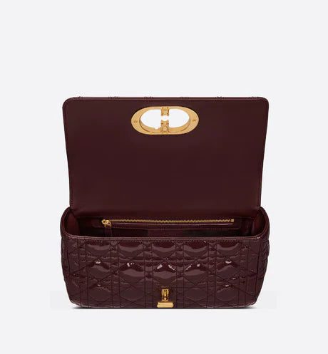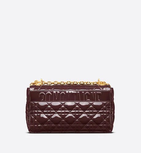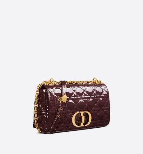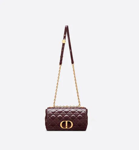 The Dior Caro bag combines modernity with timeless elegance. The design is crafted in amaranth patent calfskin with Cannage stitching and features a flap adorned with an antique gold-finish metal 'CD' twist clasp, inspired by the seal of a Christian Dior perfume bottle. The detachable chain shoulder strap with 'CD' signature links allows the medium bag to be carried by hand, worn over the shoulder or crossbody, and can be replaced by one of the House's wide embroidered straps for day or evening attire.