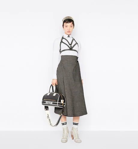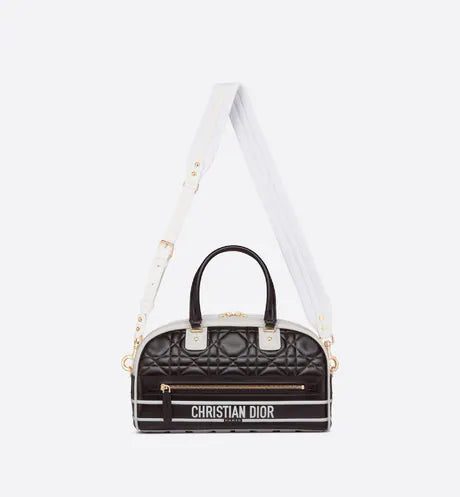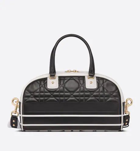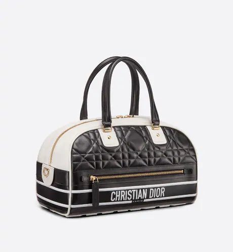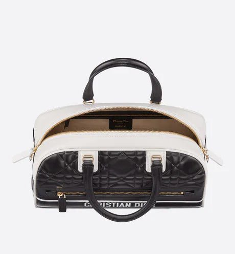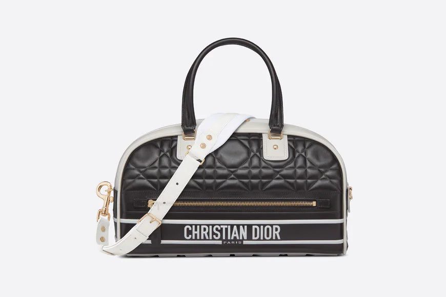 New this season, Maria Grazia Chiuri presents the Dior Vibe Zip Bowling bag, a functional creation that brings together sportswear codes and the couture spirit of the House. Crafted in black and white padded Macrocannage calfskin, it boasts the 'CHRISTIAN DIOR PARIS' signature, highlighted by a zip pocket at the front. The underside features a tonal sculpted rubber star motif inspired by House sneakers. The medium bag can be paired with other Dior Vibe creations to complete the look.