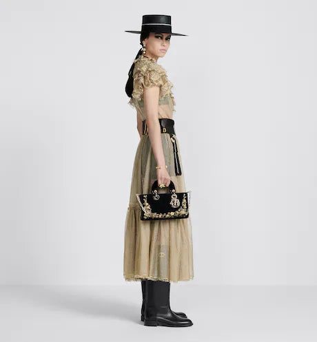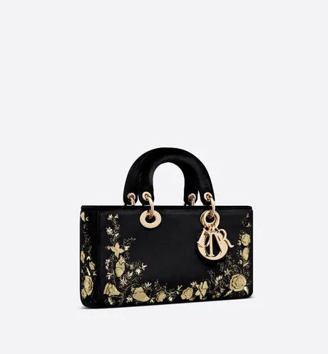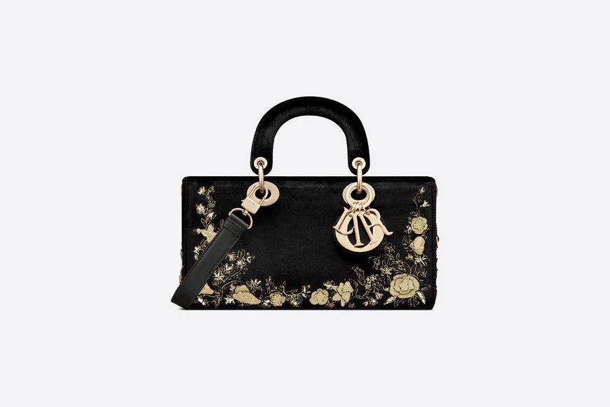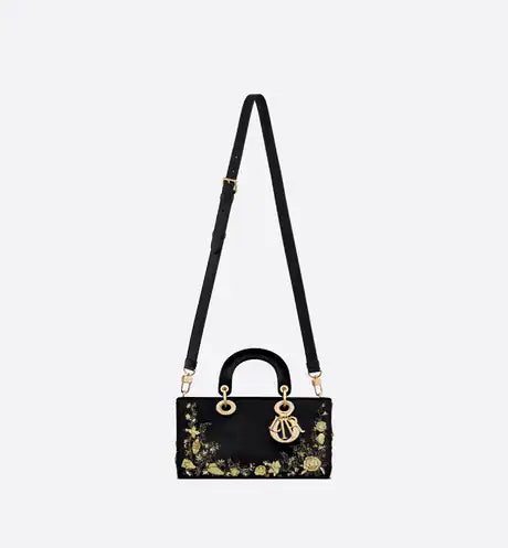 The Lady D-Joy bag captures the House's vision of elegance and beauty by showcasing the iconic streamlined aesthetic of the Lady Dior line. Demonstrating the House's exceptional savoir-faire, the black velvet style is embroidered with the Dior Jardin Botanique motif in gold-tone metallic thread, a romantic floral pattern inspired by the Granville gardens so dear to Mr. Dior. Pale gold-finish metal 'D.I.O.R.' charms further embellish and illuminate its silhouette. Featuring one removable chain strap and another adjustable and removable leather strap, the medium Lady D-Joy bag can be carried by hand, worn over the shoulder or crossbody as a daily companion.