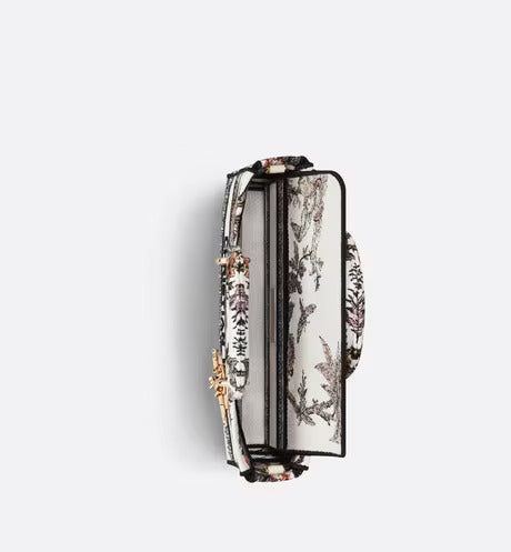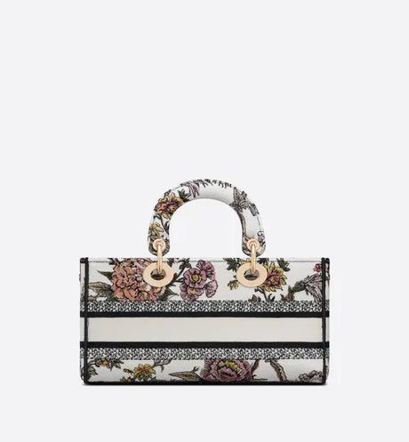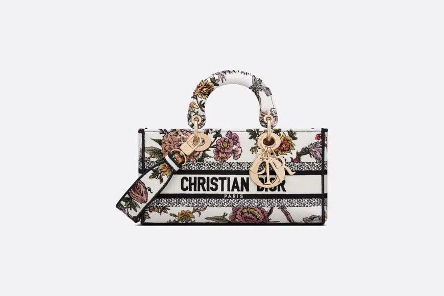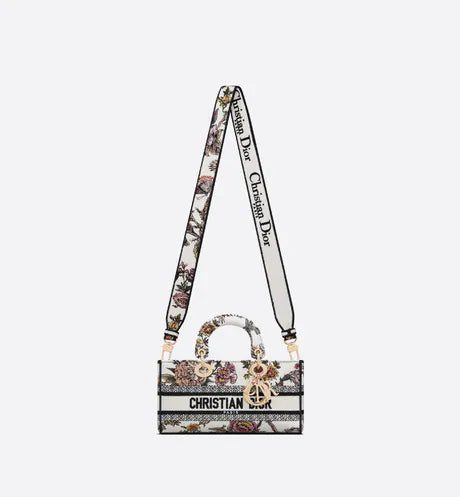 The Lady D-Joy bag captures the House's vision of elegance and beauty by showcasing the iconic streamlined aesthetic of the Lady Dior line. Fully embroidered with the multicolor Dior Jardin Botanique motif, the style features a romantic floral pattern inspired by the Granville gardens so dear to Mr. Dior. Pale gold-finish metal 'D.I.O.R.' charms further embellish and illuminate its silhouette. Featuring one removable chain strap and another adjustable and removable leather strap, the medium Lady D-Joy bag can be carried by hand, worn over the shoulder or crossbody as a daily companion.