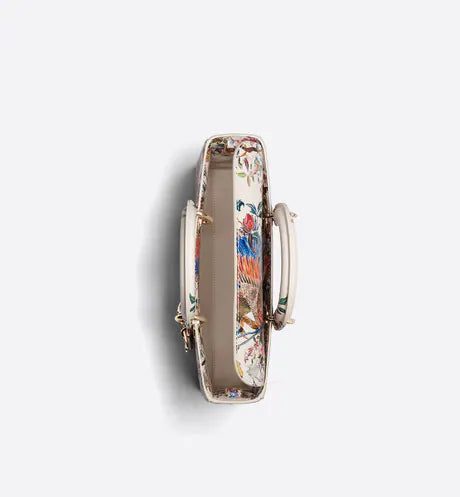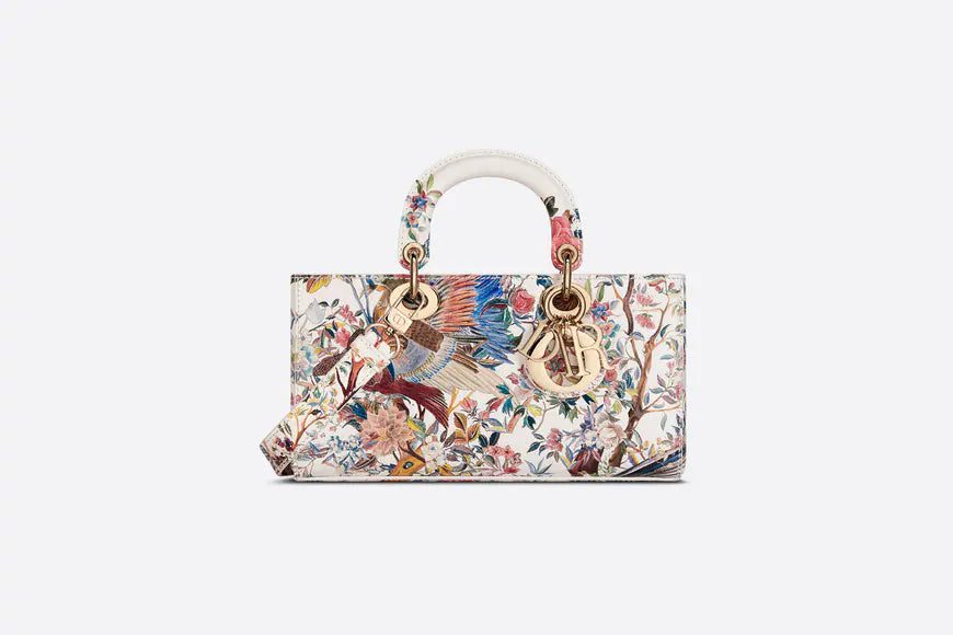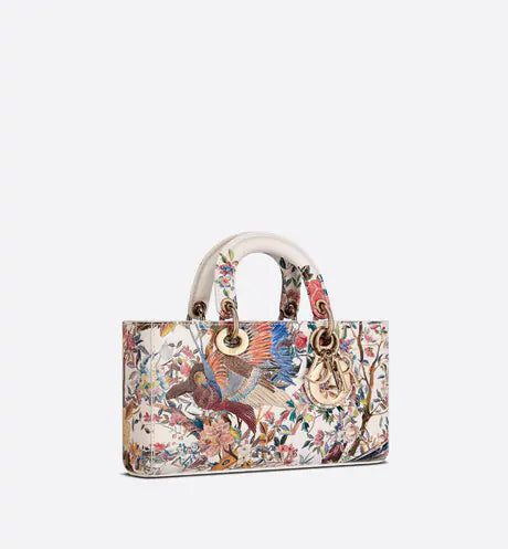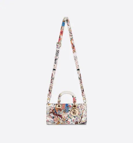 The Lady D-Joy bag captures the House's vision of elegance and beauty by showcasing the iconic streamlined aesthetic of the Lady Dior line. Demonstrating the House's exceptional savoir-faire, the latte multicolor calfskin style features the sculpted and hand-painted Dior Jardin d'Hiver motif, offering a poetic and exotic interpretation of Mr. Dior's wall tapestries. Pale gold-finish metal 'D.I.O.R.' charms further embellish its silhouette. Featuring one removable chain shoulder strap and another adjustable and removable leather shoulder strap, the medium Lady D-Joy bag can be carried by hand, worn over the shoulder or crossbody as a daily companion.