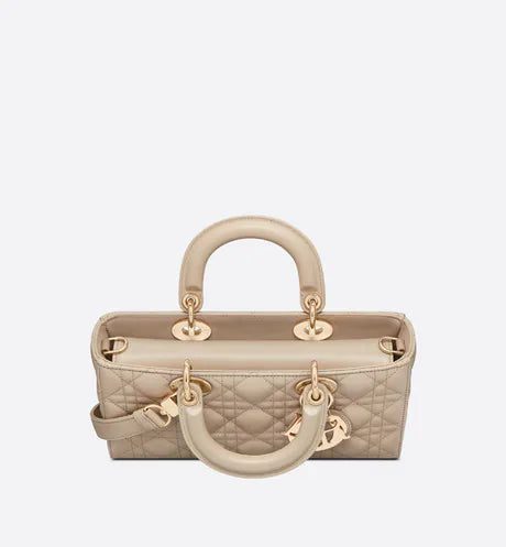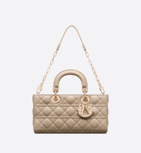 The Lady D-Joy bag captures the House's vision of elegance and beauty. Refined and sleek, this timeless style showcases the iconic streamlined aesthetic of the Lady Dior line. Crafted in sand-colored lambskin with Cannage stitching, it is enhanced by pale gold-finish metal 'D.I.O.R.' charms embellishing its silhouette. Featuring one removable chain shoulder strap and another adjustable and removable leather shoulder strap, the medium Lady D-Joy bag can be carried by hand or worn crossbody as a daily companion.