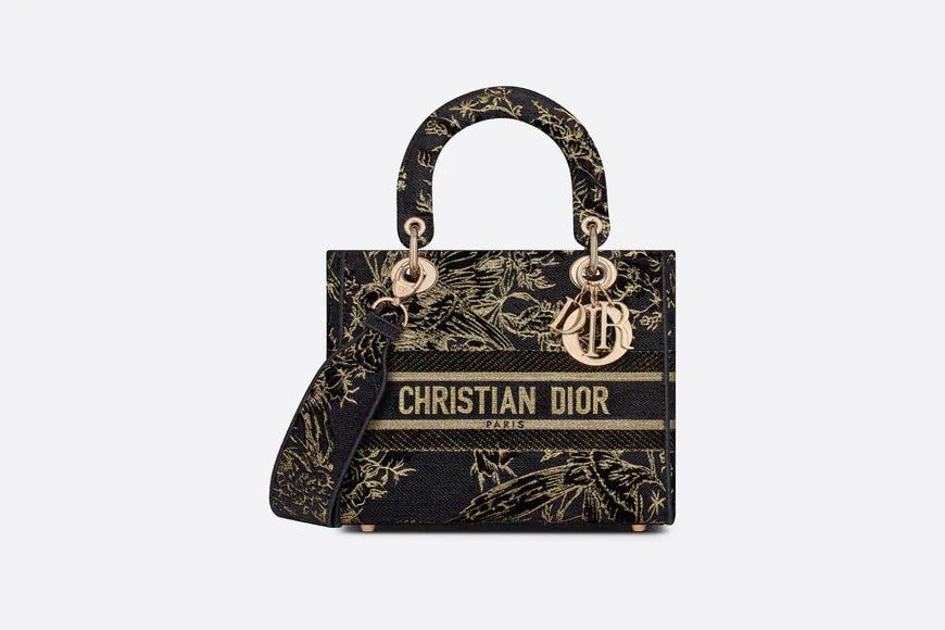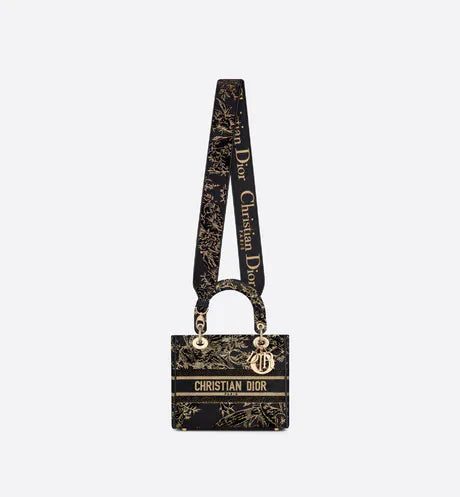 The Lady D-Lite bag combines classic elegance with House modernity. The black multicolor Dior Jardin d'Hiver embroidered cotton with velvet and metallic thread style offers a poetic and exotic interpretation of Mr. Dior's wall tapestries. The front features a 'CHRISTIAN DIOR PARIS' signature while 'D.I.O.R.' charms in pale gold-finish metal enhance and illuminate the silhouette. Equipped with a wide, reversible and removable embroidered shoulder strap, the medium Lady D-Lite bag can be carried by hand or worn crossbody.