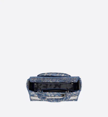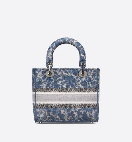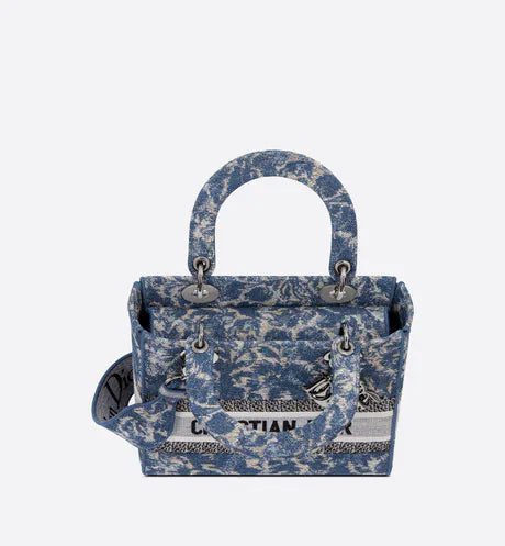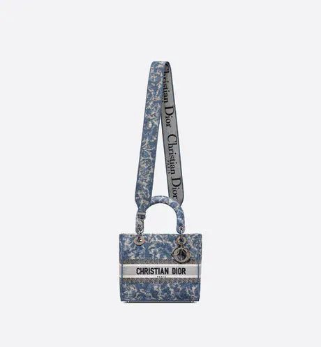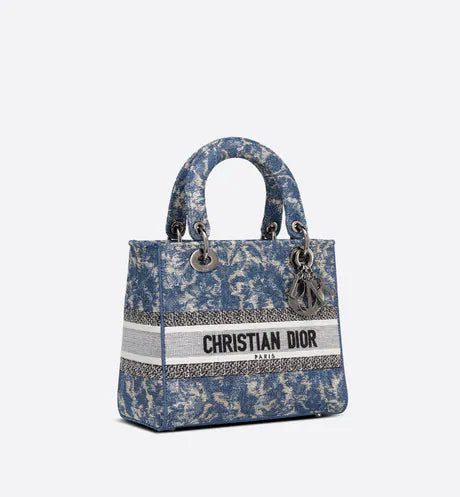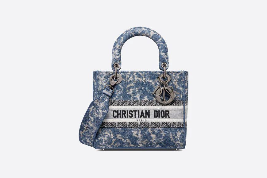 The Lady D-Lite bag combines classic elegance with House modernity. The style is fully embroidered with the blue Dior Brocart motif in a denim effect, offering a modern new take on House codes. The front features a 'CHRISTIAN DIOR PARIS' signature while the 'D.I.O.R.' charms in ruthenium-finish metal further enhance the silhouette. Equipped with a wide, reversible and removable embroidered shoulder strap, the medium Lady D-Lite bag can be carried by hand or worn crossbody.
