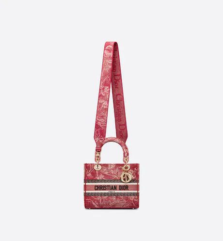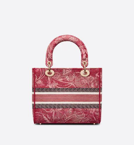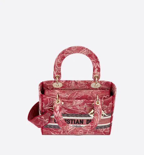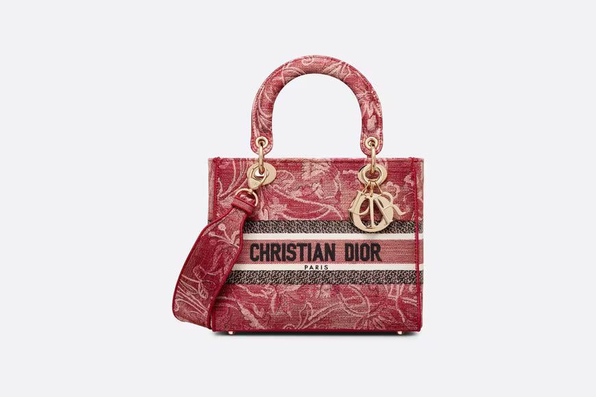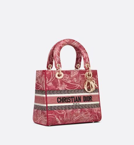 The Lady D-Lite bag combines classic elegance with House modernity. The style is fully embroidered with the metallic red Dior Brocart motif, offering a modern new take on House codes. The front features a 'CHRISTIAN DIOR PARIS' signature while the 'D.I.O.R.' charms in pale gold-finish metal further enhance the silhouette. Equipped with a wide, reversible and removable embroidered shoulder strap, the medium Lady D-Lite bag can be carried by hand or worn crossbody.