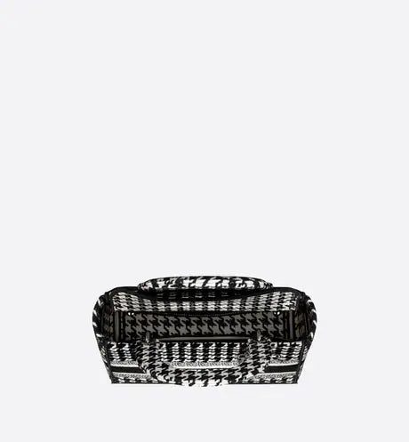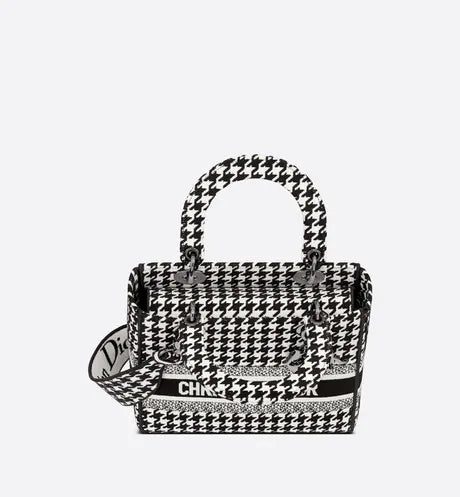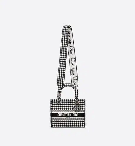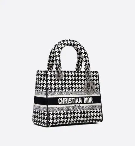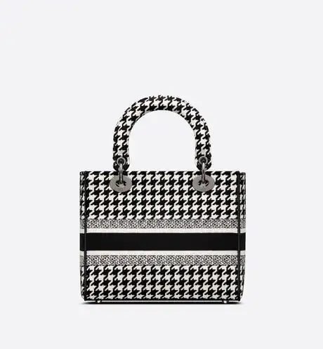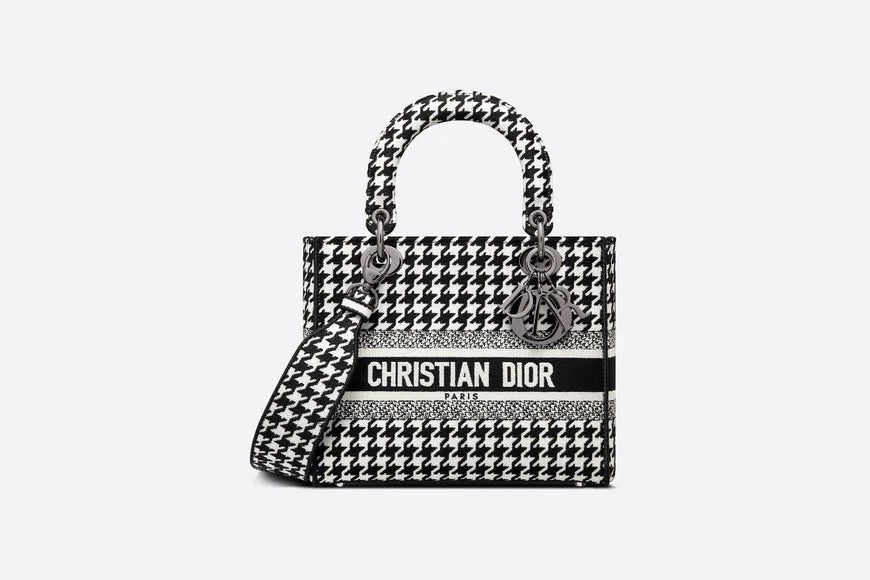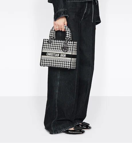 The Lady D-Lite bag combines classic elegance with House modernity. The style is fully embroidered with the black and white Houndstooth motif, and is accented with the 'CHRISTIAN DIOR PARIS' signature on the front. Ruthenium-finish metal 'D.I.O.R.' charms embellish and illuminate the silhouette. Equipped with a wide, reversible and removable embroidered shoulder strap, the medium Lady D-Lite bag can be carried by hand or worn crossbody.