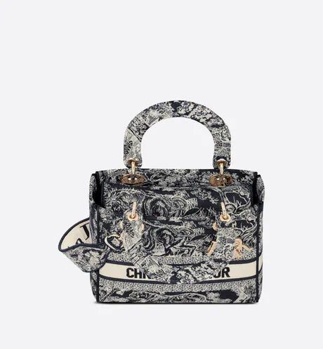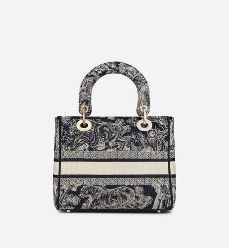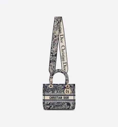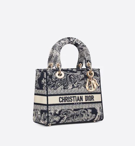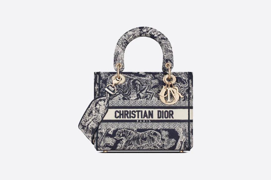 The Lady D-Lite bag combines classic elegance with House modernity. The style is fully embroidered with the blue Toile de Jouy Reverse motif, a variation of the hallmark House pattern with a play on reversed colors. The front features a 'CHRISTIAN DIOR PARIS' signature while the thick 'D.I.O.R.' charms in pale gold-finish metal enhance the silhouette. Equipped with a wide, reversible and removable embroidered shoulder strap, the medium Lady D-Lite bag can be carried by hand or worn crossbody.