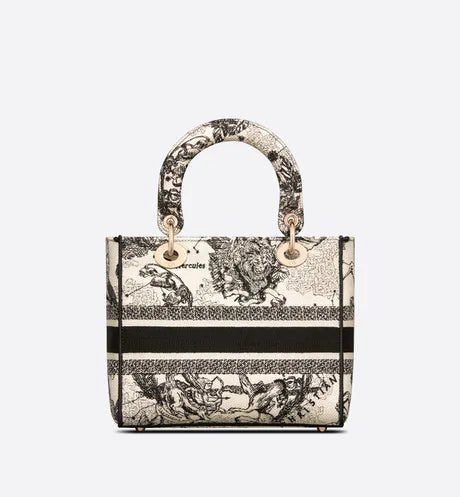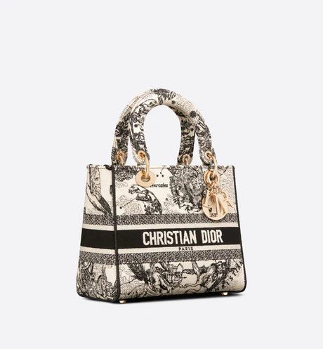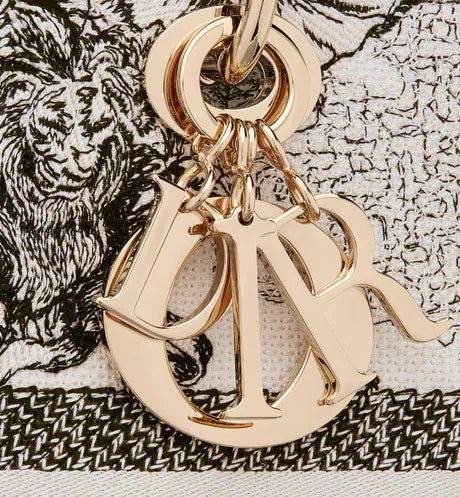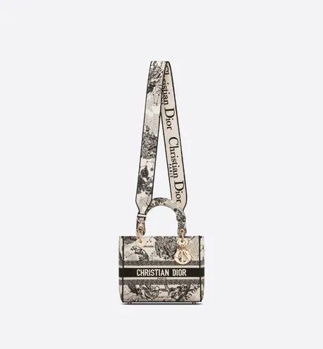The Lady D-Lite bag combines classic elegance with House modernity. The style is fully embroidered with the latte Toile de Jouy Zodiac motif, a new take on the iconic pattern inspired by Mr. Dior's passion for astrology. A 'CHRISTIAN DIOR PARIS' signature adorns the front, while thick 'D.I.O.R.' charms in pale gold-finish metal further enhance and highlight the silhouette. Featuring a wide, reversible and removable embroidered shoulder strap, the medium Lady D-Lite bag can be carried by hand or worn crossbody.