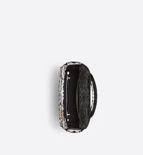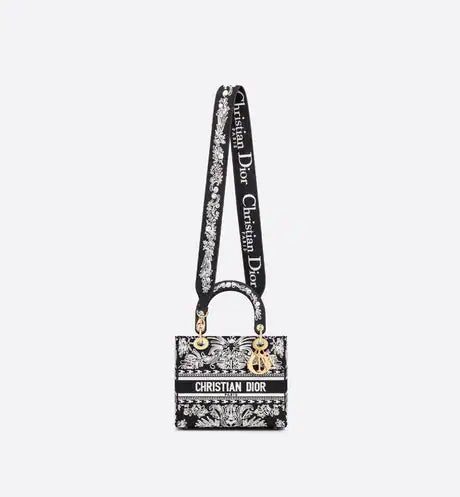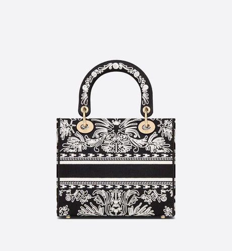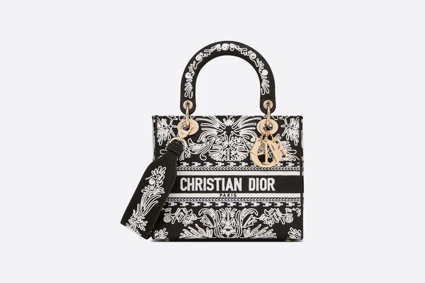 The Lady D-Lite bag combines classic elegance with House modernity. The style is fully embroidered with the black and white Ornamental motif, featuring a Cornely-effect and inspired by Andalusian baroque in a graphic spirit. The front features a 'CHRISTIAN DIOR PARIS' signature while the 'D.I.O.R.' charms in pale gold-finish metal further enhance the silhouette. Equipped with a wide, reversible and removable embroidered shoulder strap, the medium Lady D-Lite bag can be carried by hand or worn crossbody.