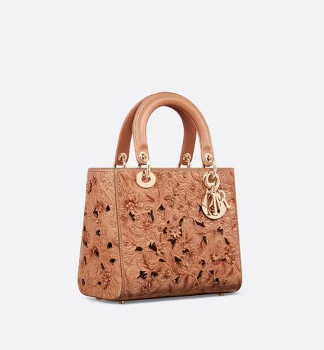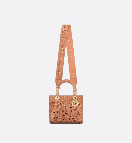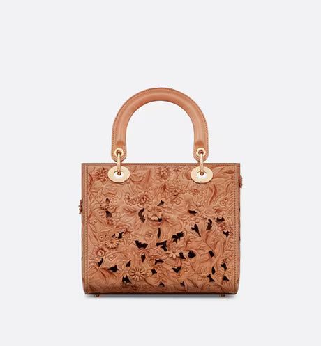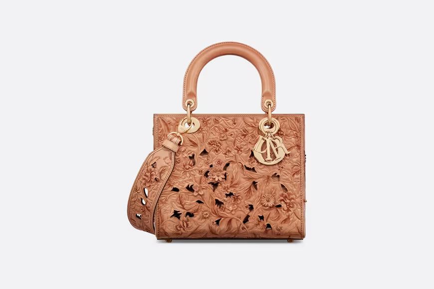 The Lady Dior bag captures the House's vision of beauty and elegance. Sleek and refined, the timeless style is crafted in beige calfskin and presents the sculpted and hand-painted multicolor Dior Petites Fleurs motif, a romantic and vibrant homage to Mr. Dior's passion for florals. Pale gold-finish metal D.I.O.R. charms offer elegant appeal. Equipped with a wide, removable leather shoulder strap, the medium Lady Dior bag can be carried by hand or worn crossbody.
