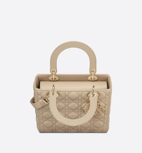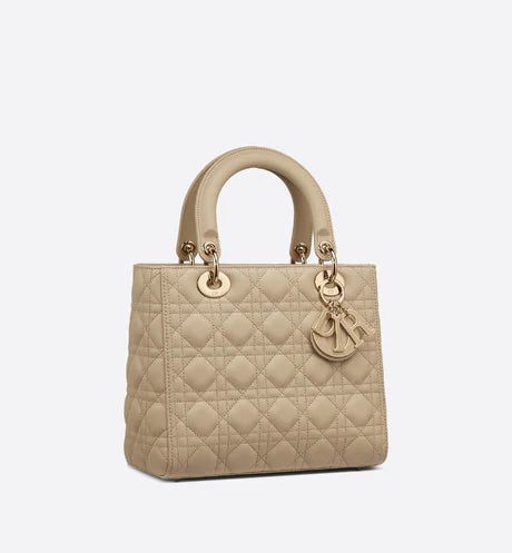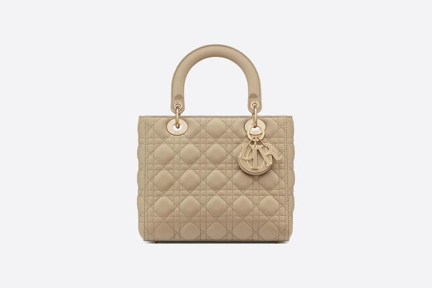 The Lady Dior bag epitomizes Dior's vision of elegance and beauty. Sleek and refined, the timeless style is crafted in beige lambskin with Cannage stitching, creating the instantly recognizable quilted texture, while the tonal enamel 'D.I.O.R.' charms further embellish its silhouette. Featuring a thin, removable leather shoulder strap, the medium Lady Dior bag can be carried by hand or worn crossbody.