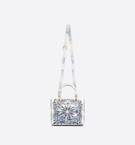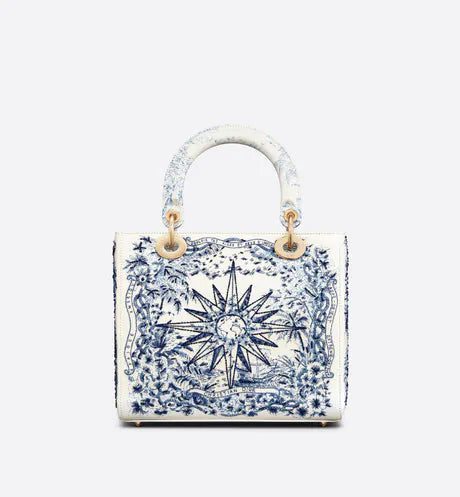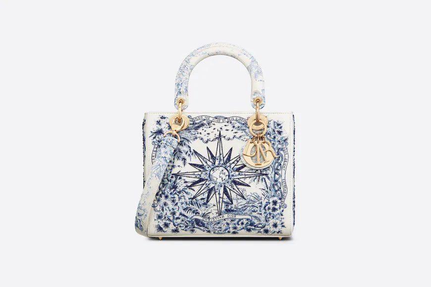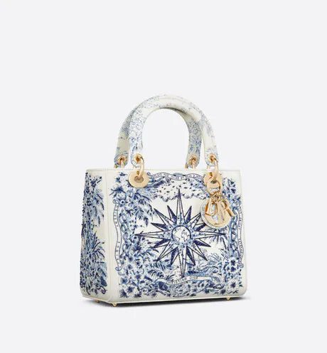 The Lady Dior bag embodies the House's vision of elegance and beauty. The refined, timeless creation is crafted in blue multicolor calfskin embroidered with the Rêve d'Infini motif by Pietro Ruffo, offering a dreamlike new take on Christian Dior's favorite star symbol and essential House code. The pale gold-finish metal signature 'D.I.O.R.' charms further embellish its silhouette. Featuring a thin, removable leather shoulder strap, the medium Lady Dior bag can be carried by hand or worn crossbody.