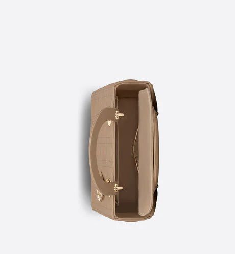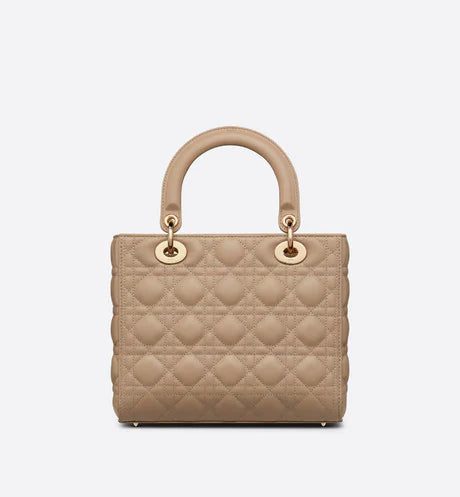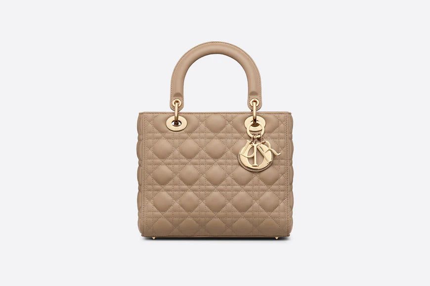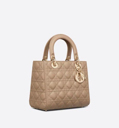 The Lady Dior bag embodies Dior's vision of elegance and beauty. Sleek and refined, the timeless yet modern style is crafted in hazelnut lambskin with Cannage stitching, creating the instantly recognizable quilted texture. The pale gold-finish metal 'D.I.O.R.' charms further embellish its silhouette. Featuring a thin, removable leather shoulder strap, the medium Lady Dior bag can be carried by hand or worn crossbody as an ideal evening wear companion.