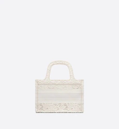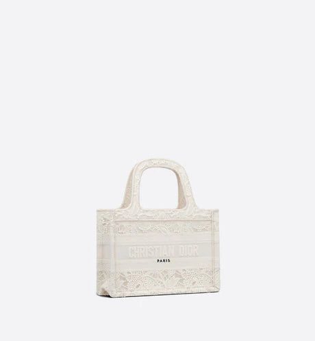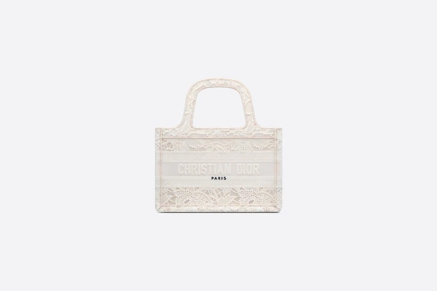 The Dior Book Tote, as imagined by Maria Grazia Chiuri, has become an essential item of the Dior spirit. The silhouette is fully embroidered with a natural-colored macramé effect. A prime example of the House's savoir-faire, the miniature bag may be carried by hand.