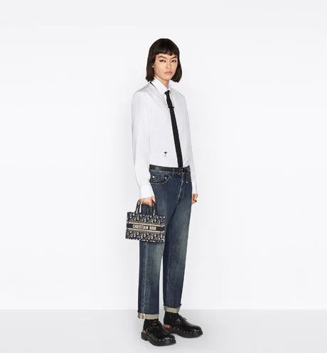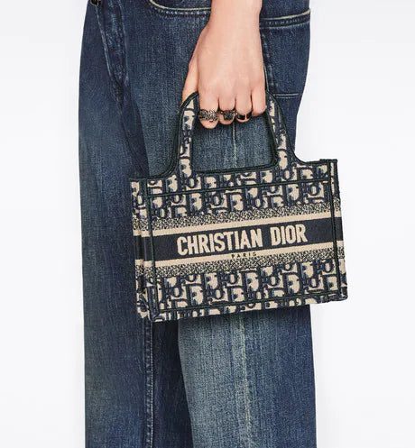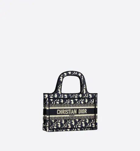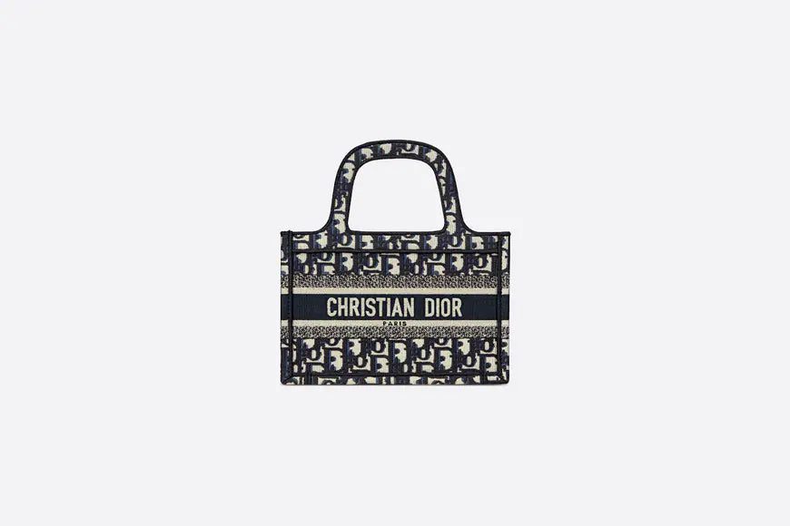 The Dior Book Tote, as imagined by Maria Grazia Chiuri, has become an essential item of the Dior aesthetic. The silhouette is fully embroidered with the House's hallmark blue Dior Oblique motif. A prime example of Dior savoir-faire, the miniature bag may be carried by hand and can be paired with other Dior Oblique creations.