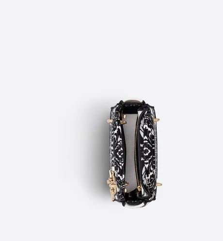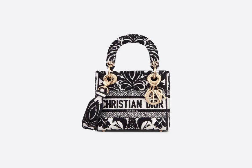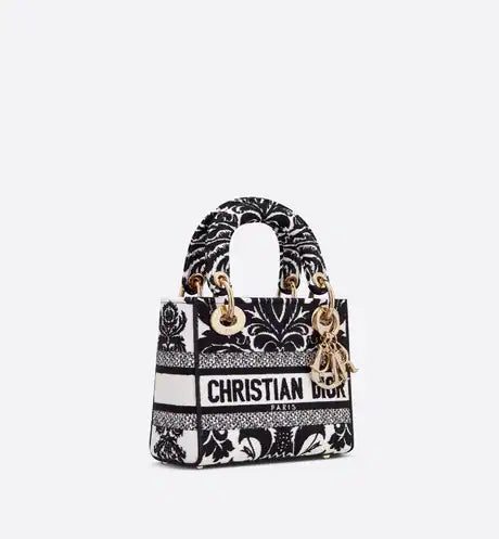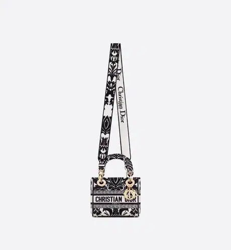 The Lady D-Lite bag combines classic elegance with House modernity. The style is fully embroidered with a white multicolor Ornamental motif inspired by Andalusian baroque in a graphic spirit. The front features a 'CHRISTIAN DIOR PARIS' signature while the 'D.I.O.R.' charms in pale gold-finish metal further enhance the silhouette. Equipped with a wide, reversible and removable embroidered shoulder strap, the miniature Lady D-Lite bag can be carried by hand or worn crossbody.