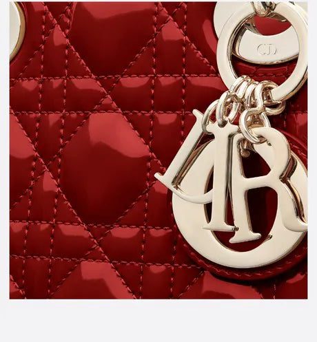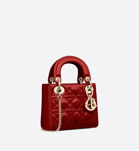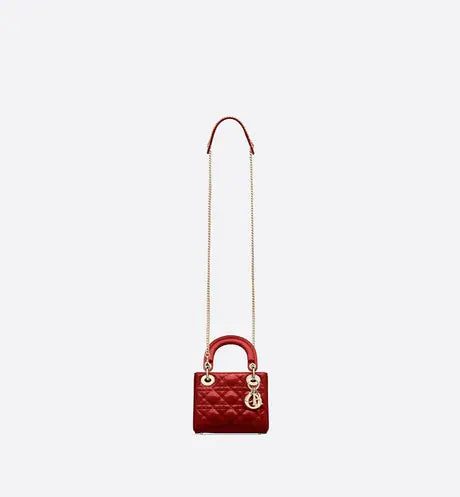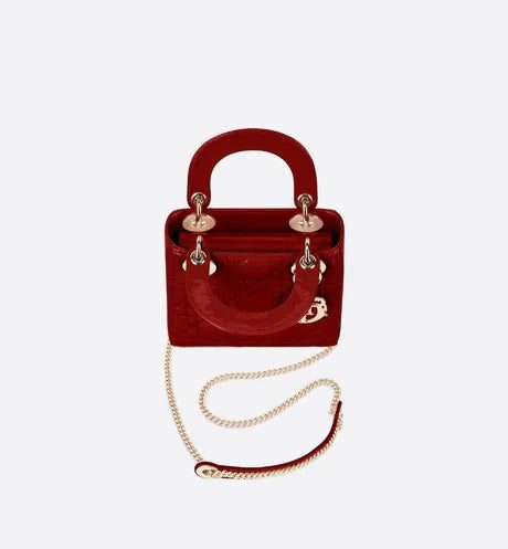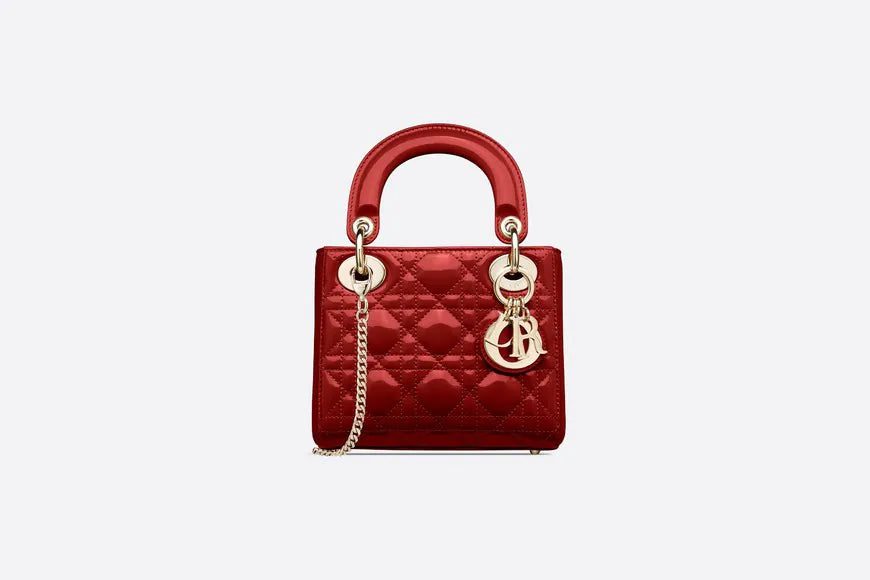 The Lady Dior bag embodies the House's vision of elegance and beauty. Sleek and refined, the style is timeless. It is crafted in cherry red patent calfskin with Cannage stitching, creating the instantly recognizable quilted texture, while the pale gold-finish metal 'D.I.O.R.' charms further embellish its silhouette. Featuring a removable chain shoulder strap, the miniature Lady Dior bag can be carried by hand or crossbody as an ideal evening wear companion.