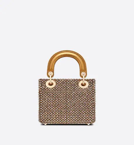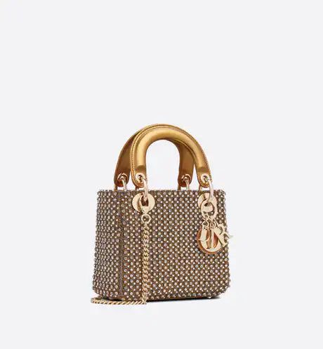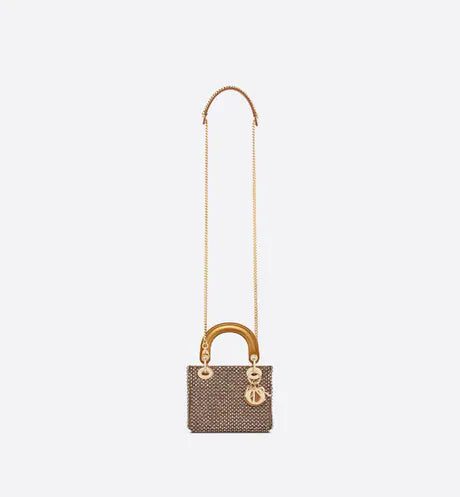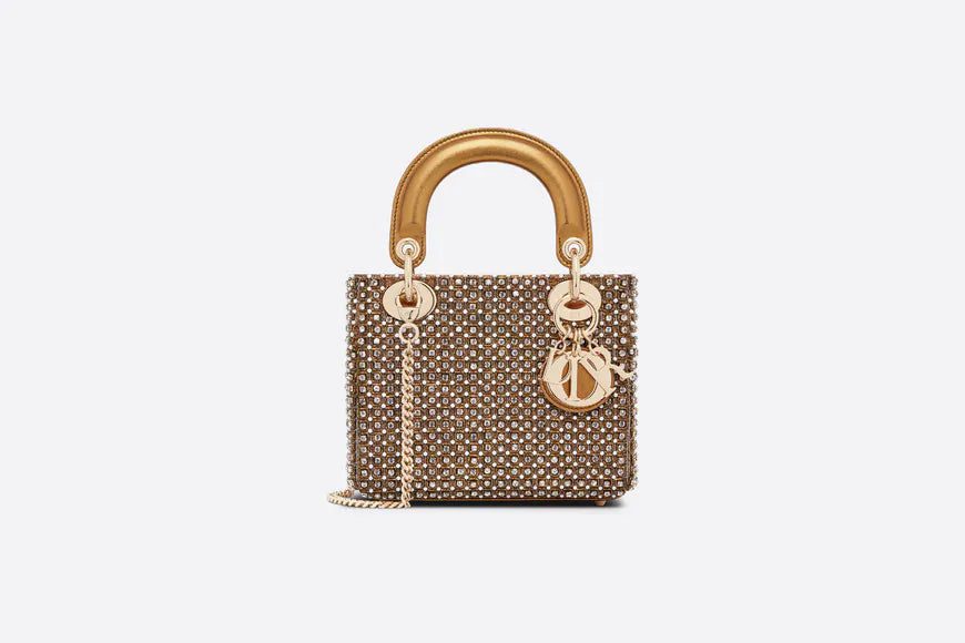 The Lady Dior bag embodies Dior's vision of elegance and beauty. Sleek and refined, the timeless style is crafted in a gold-tone embroidery with a square motif adorned with strass and white round beads. The pale gold-finish metal 'D.I.O.R.' charms embellish and illuminate its silhouette. Featuring a removable chain shoulder strap, the miniature Lady Dior bag can be carried by hand or worn crossbody as an ideal evening wear companion.