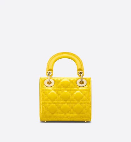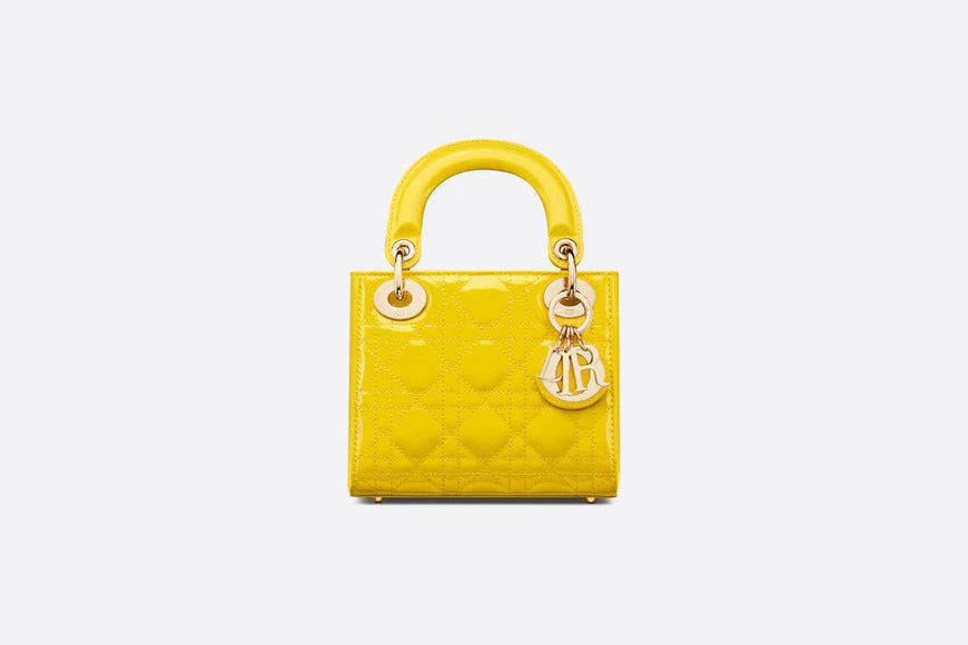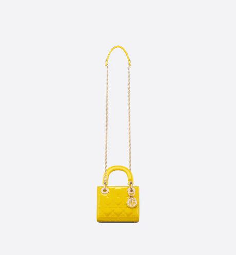 The Lady Dior handbag epitomizes the House's vision of elegance and beauty. Sleek and refined, the style is timeless. It is crafted in yellow patent calfskin with Cannage stitching, creating the instantly recognizable quilted texture. The pale gold-finish metal signature 'D.I.O.R.' charms embellish and illuminate its silhouette. Featuring a removable chain strap, the miniature Lady Dior bag can be carried by hand or worn crossbody as an ideal evening companion.