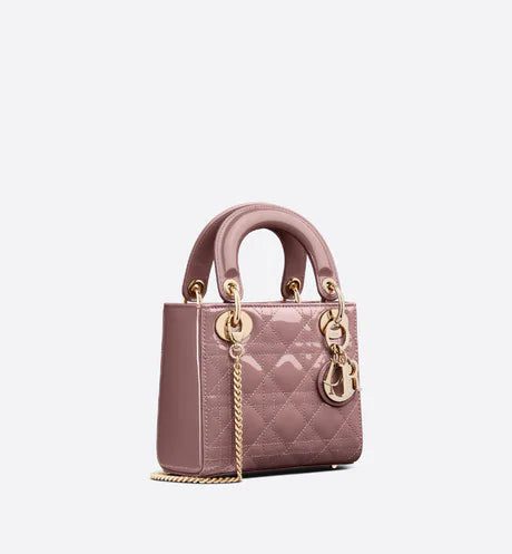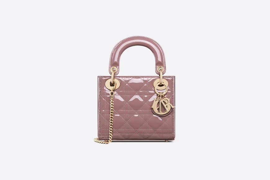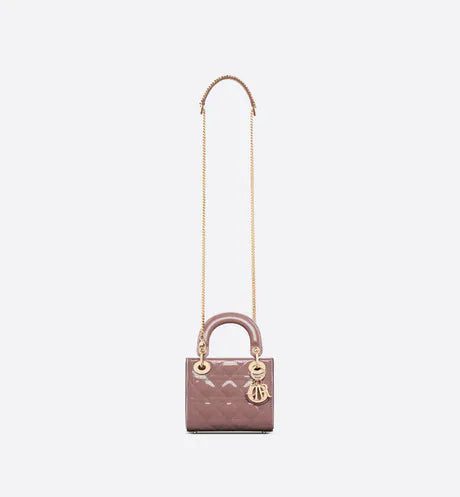 The Lady Dior handbag epitomizes the House's vision of elegance and beauty. Sleek and refined, the style is timeless. It is crafted in peony pink patent calfskin with Cannage stitching, creating the instantly recognizable quilted texture. The pale gold-finish metal signature 'D.I.O.R.' charms embellish and illuminate its silhouette. Featuring a removable chain strap, the miniature Lady Dior bag can be carried by hand or worn crossbody as an ideal evening companion.