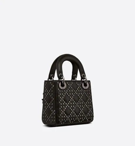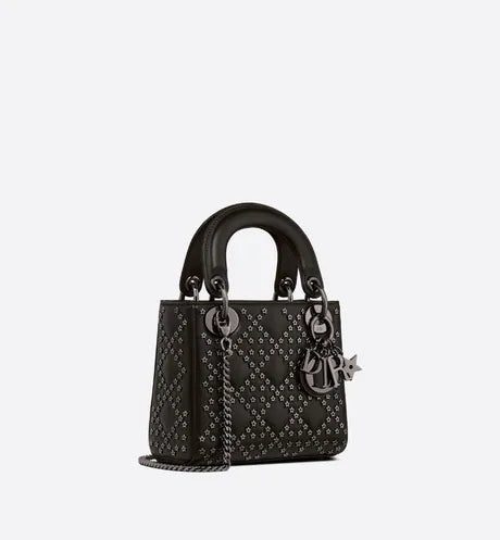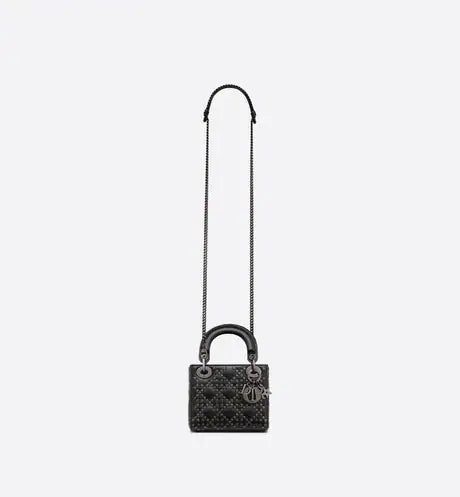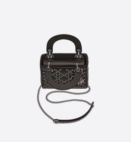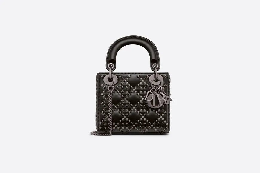 The Lady Dior Bag embodies the House's vision of elegance and beauty. Refined and graceful, the timeless creation is crafted in black Lucky Star Cannage lambskin, offering a new take on the iconic motif and featuring hand-applied stars. Ruthenium-finish metal 'D.I.O.R.' charms embellish and illuminate the silhouette. Boasting a removable chain shoulder strap, the miniature Lady Dior bag will make an ideal evening companion and may be carried by hand or worn crossbody.