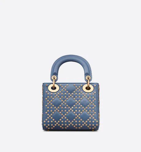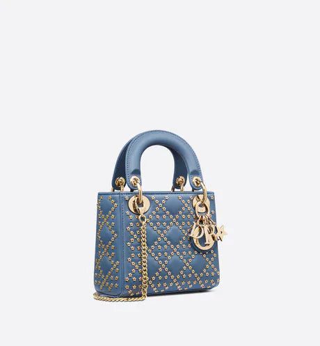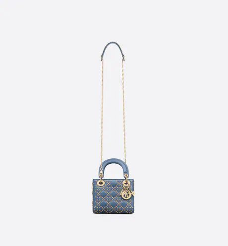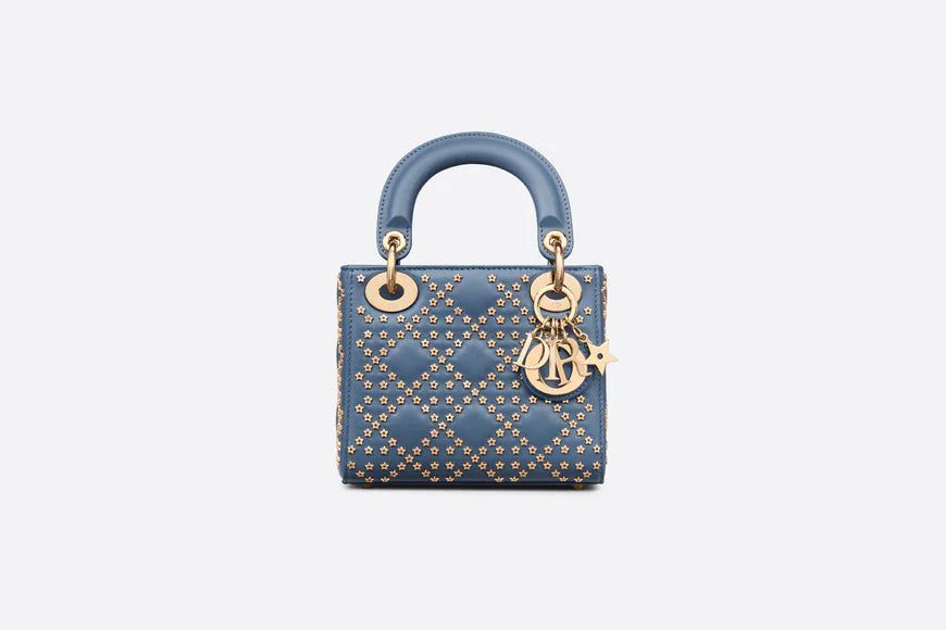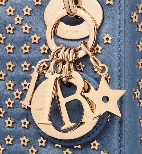 The Lady Dior Bag embodies the House's vision of elegance and beauty. Refined and graceful, the timeless creation is crafted in denim blue Lucky Star Cannage lambskin, offering a new take on the iconic motif and featuring hand-applied stars. Pale gold-finish metal 'D.I.O.R.' charms embellish and illuminate the silhouette. Boasting a removable chain shoulder strap, the miniature Lady Dior bag will make an ideal evening companion and may be carried by hand or worn crossbody.