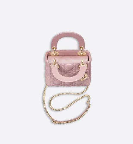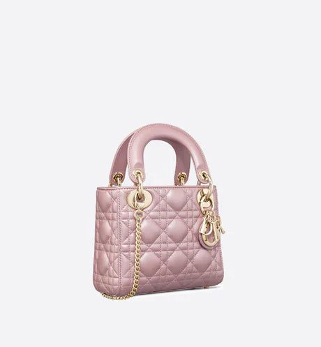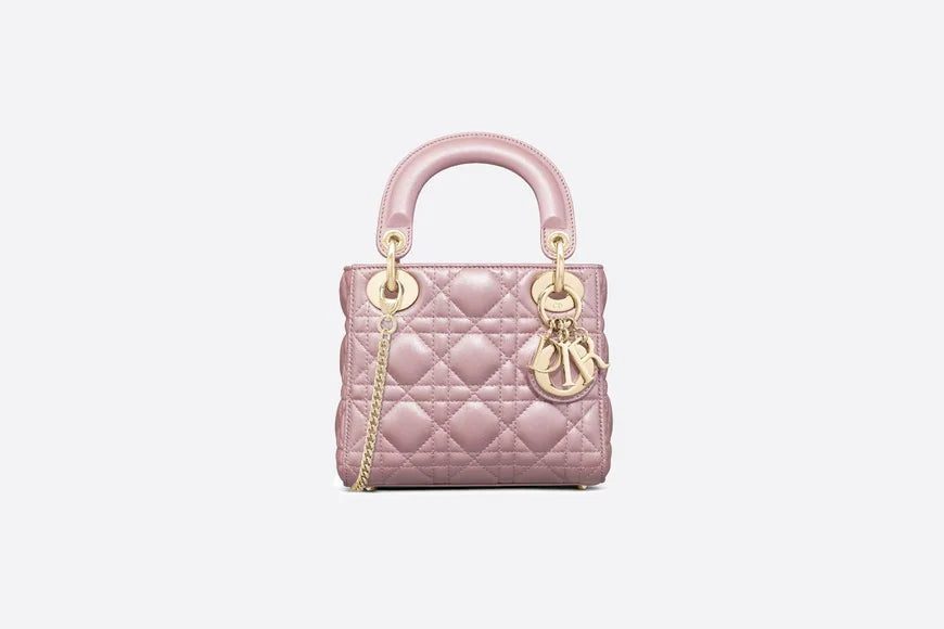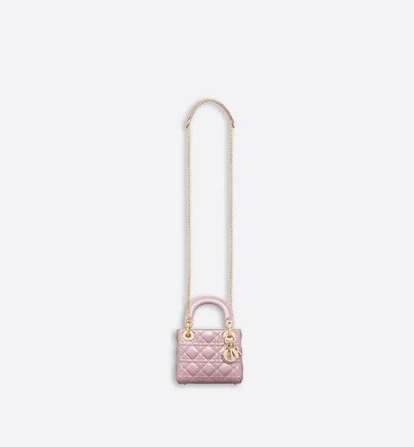 The Lady Dior handbag epitomizes the House's vision of elegance and beauty. Refined and sleek, this creation is timeless. Crafted in lotus-colored pearlescent lambskin and covered with Cannage stitching, it boasts an instantly recognizable quilted texture. The pale gold-finish metal 'D.I.O.R.' charms embellish and illuminate its silhouette. Featuring a removable chain shoulder strap, the miniature Lady Dior bag can be carried by hand or worn crossbody as an ideal evening wear companion.