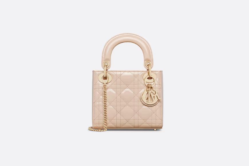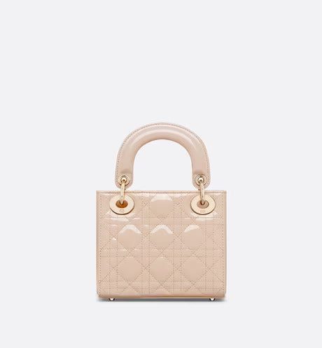 The Lady Dior handbag epitomizes the House's vision of elegance and beauty. Refined and sleek, the timeless creation is crafted in Aesthetic beige patent calfskin and covered with Cannage stitching, creating an instantly recognizable quilted texture. Pale gold-finish metal D.I.O.R. charms embellish and illuminate its silhouette. Featuring a removable chain shoulder strap, the miniature Lady Dior bag can be carried by hand or worn crossbody as an ideal evening wear companion.