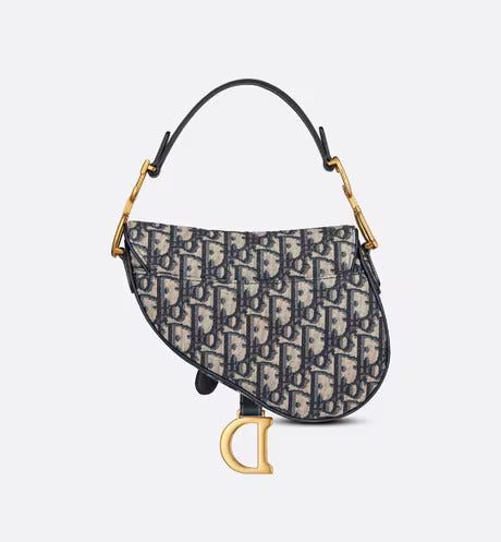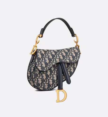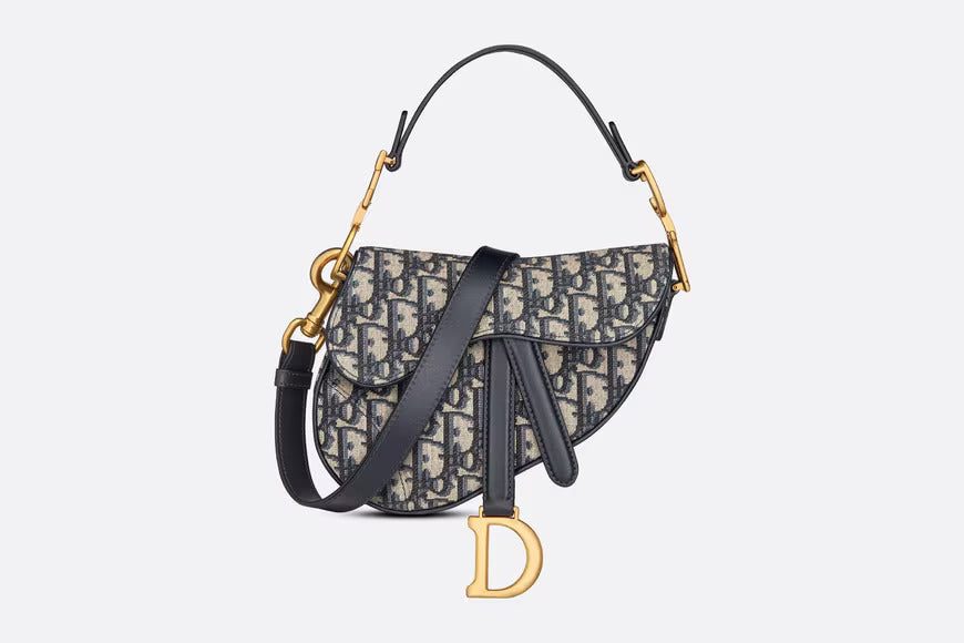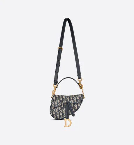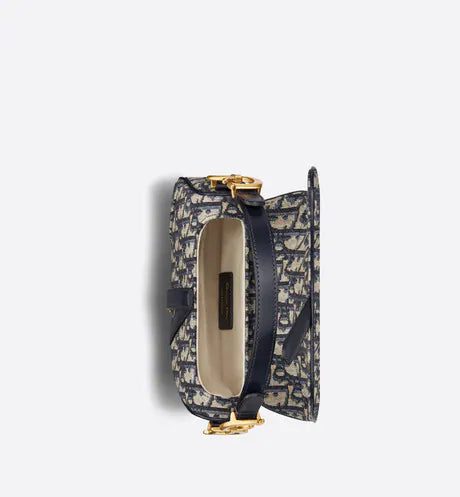 Maria Grazia Chiuri brings a fresh update to the iconic Saddle bag. Crafted in blue Dior Oblique jacquard, the legendary design presents a Saddle flap with a magnetic 'D' stirrup clasp, as well as an antique gold-finish metal 'CD' signature on either side of the strap. Featuring a thin, adjustable and removable shoulder strap, the miniature Saddle bag may be carried by hand, worn over the shoulder or crossbody.