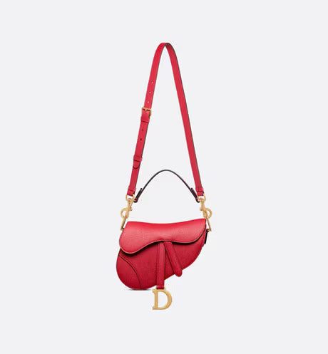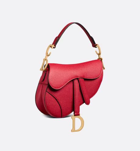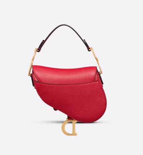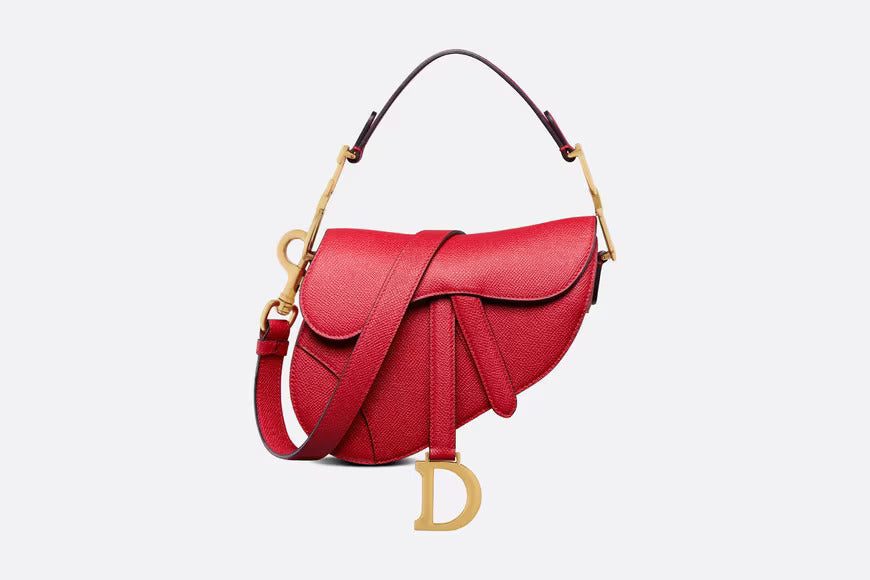 Maria Grazia Chiuri brings a fresh update to the iconic Saddle bag. Crafted in scarlet red grained calfskin, the legendary design presents a Saddle flap with a magnetic D stirrup clasp, as well as an antique gold-finish metal CD signature on either side of the strap. Featuring a thin, adjustable and removable shoulder strap, the miniature Saddle bag may be carried by hand, worn over the shoulder or crossbody.