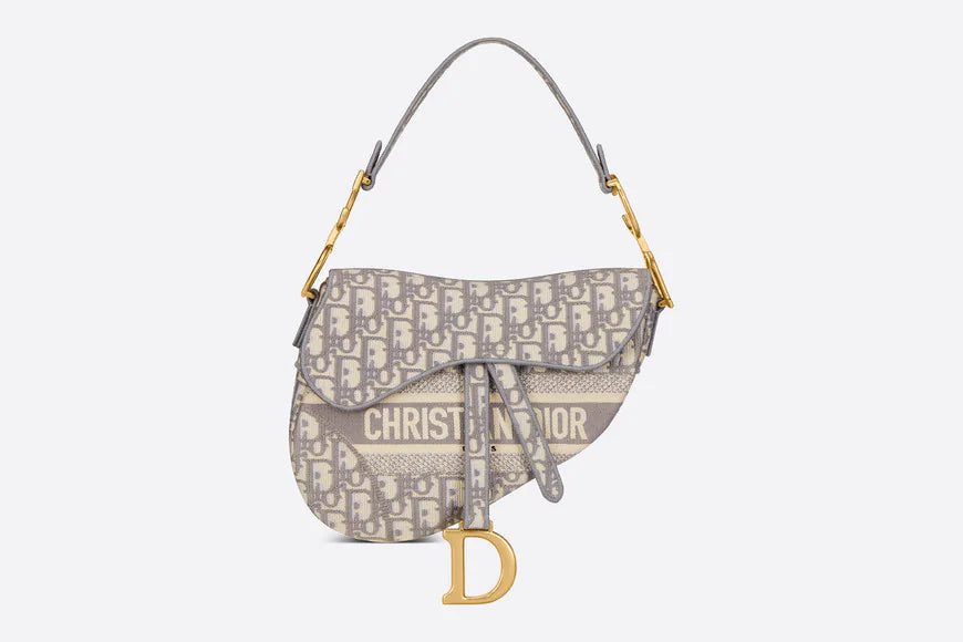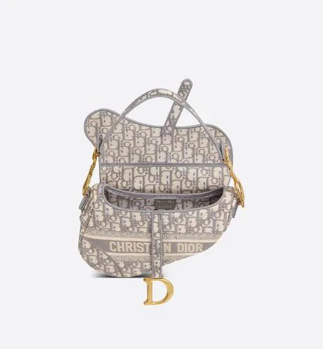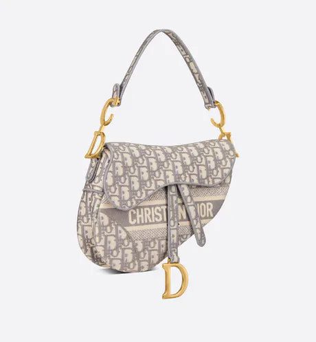 Maria Grazia Chiuri brings a fresh update to the iconic Saddle bag. The design is fully embroidered with the House's hallmark gray Dior Oblique motif. The legendary style features a Saddle flap with a magnetic 'D' stirrup clasp and boasts an antique gold-finish metal 'CD' signature on each side of the handle. The bag can be carried by hand or worn over the shoulder and may be customized with different shoulder straps.