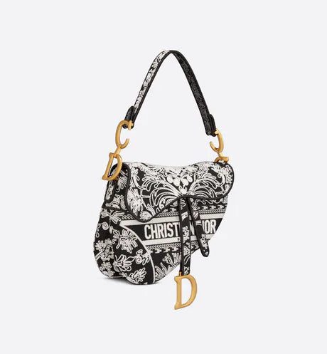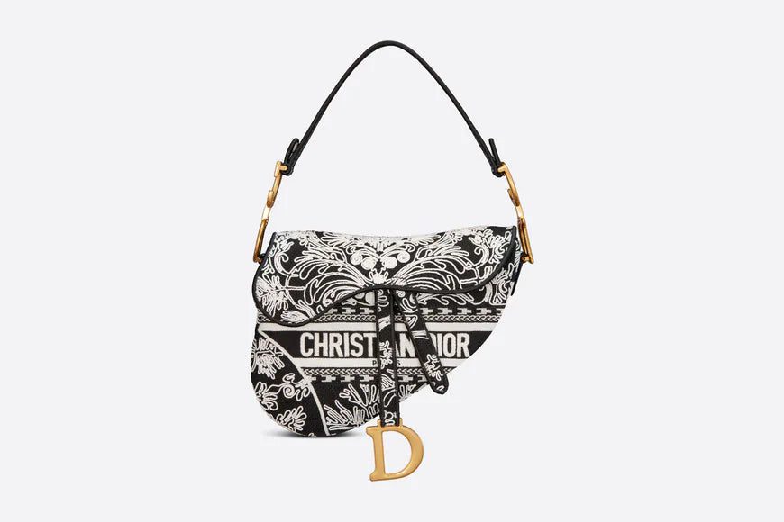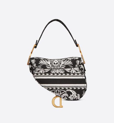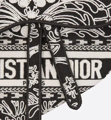 Maria Grazia Chiuri brings a fresh update to the iconic Saddle bag. The design is fully embroidered with the black and white Ornamental motif in a Cornely effect and inspired by Andalusian baroque in a graphic spirit. The legendary style features a Saddle flap with a magnetic 'D' stirrup clasp and boasts an antique gold-finish metal 'CD' signature on each side of the handle. The bag can be carried by hand or worn over the shoulder and may be customized with different shoulder straps.