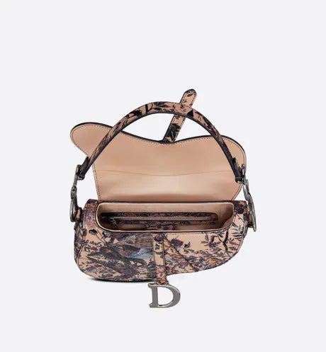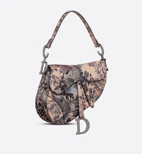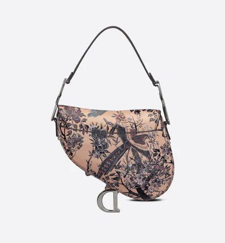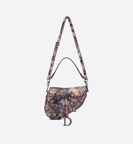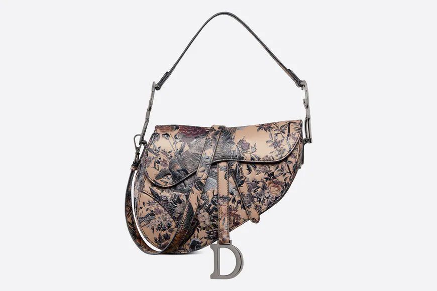 The iconic Saddle bag is updated by Maria Grazia Chiuri to demonstrate the House's exceptional savoir-faire. The beige multicolor calfskin design presents the sculpted and hand-painted Dior Jardin d'Hiver motif, offering a poetic and exotic interpretation of Mr. Dior's wall tapestries. The legendary design has a Saddle flap enhanced by a magnetic D stirrup clasp and the ruthenium-finish metal CD signature on either side of the handle. Featuring a thin, adjustable and removable shoulder strap, the Saddle bag may be carried by hand, worn over the shoulder or crossbody.